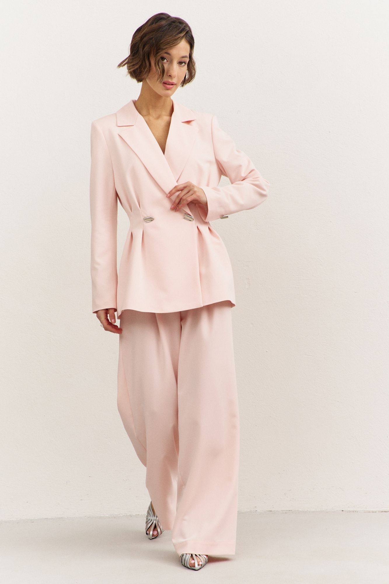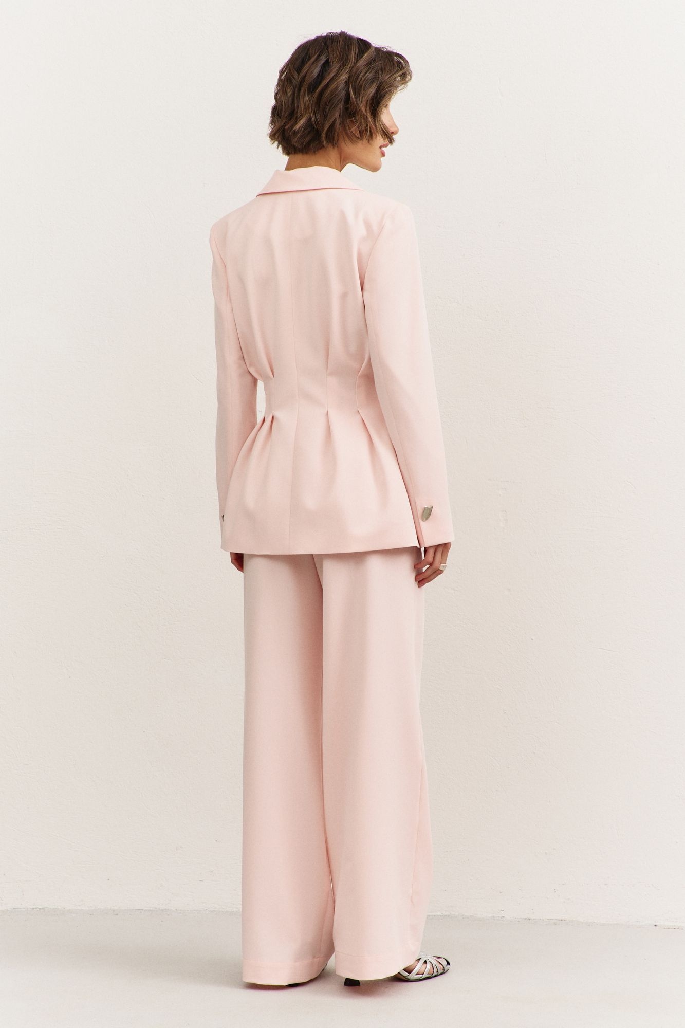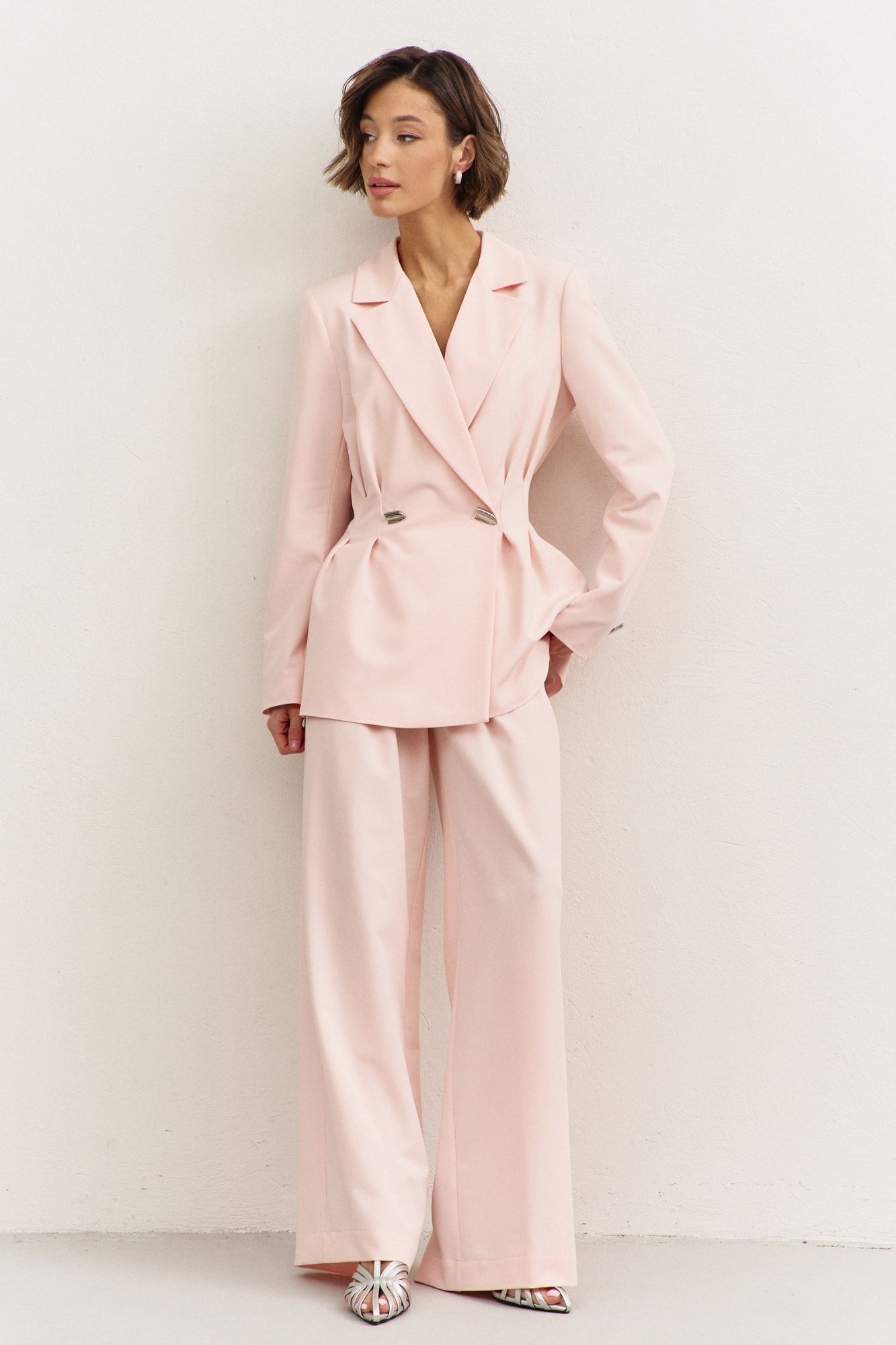 Костюм брючный 1488 RINKA. Коллекция бренда RINKA подчеркивает современную изысканность и практичность. Выполненный из костюмной ткани на основе вискозы, полиэстера и спандекса, этот костюм сочетает в себе комфорт и стиль. Жакет полуприлегающего силуэта с длиной чуть ниже линии бедер, дополнен застроченными складками в области талии и пиджачным воротником. Длинные двушовные рукава и подкладка с плечевыми накладками добавляют изысканности. Широкие брюки с притачным поясом и эластичностью на спинке обеспечивают комфорт в носке. Этот стильный комплект идеален для офисного и повседневного использования, создан для весенне-летнего сезона. Представленный в нежном кремовом цвете, он привнесет лёгкость и свежесть в ваш гардероб.