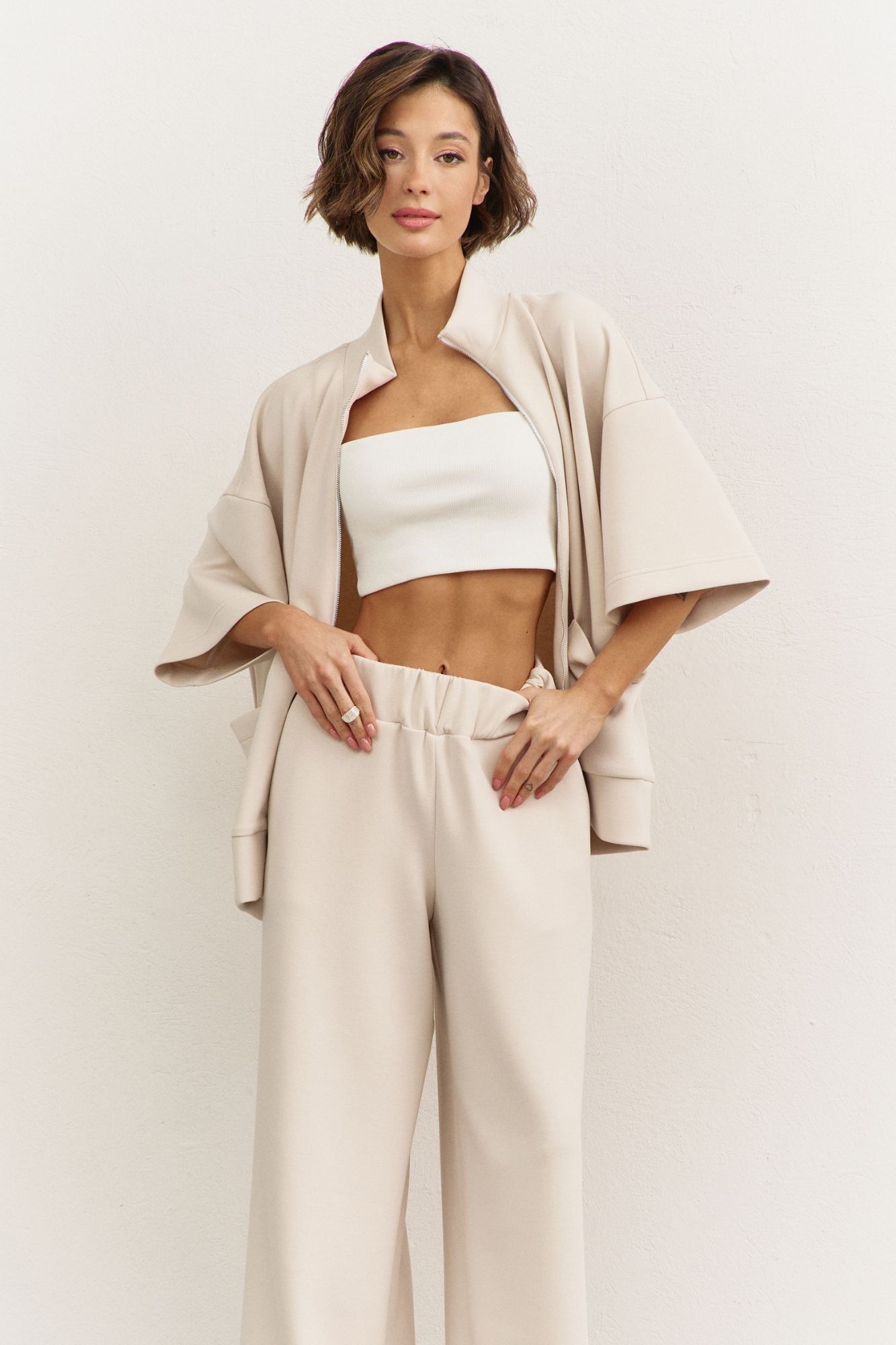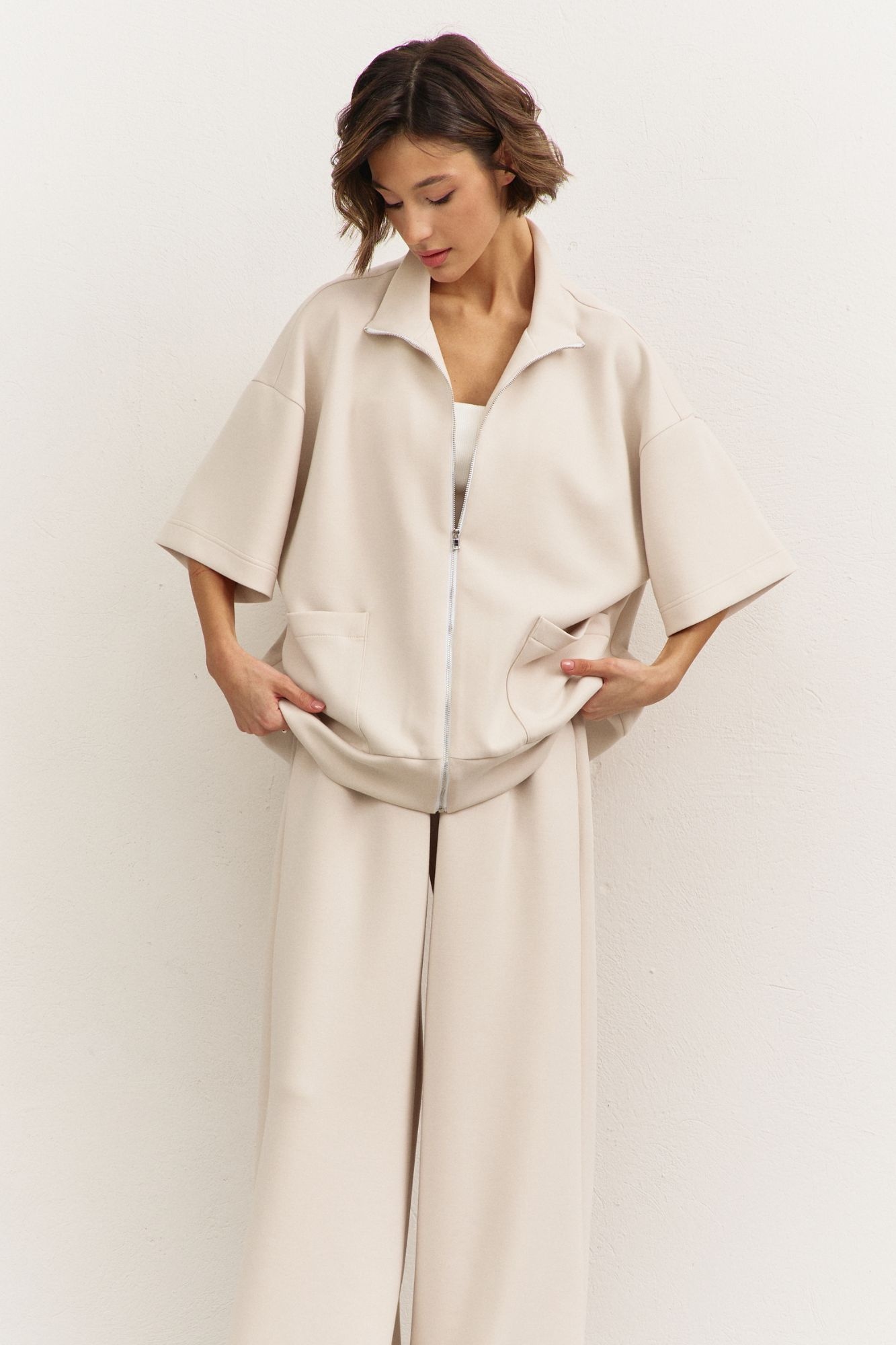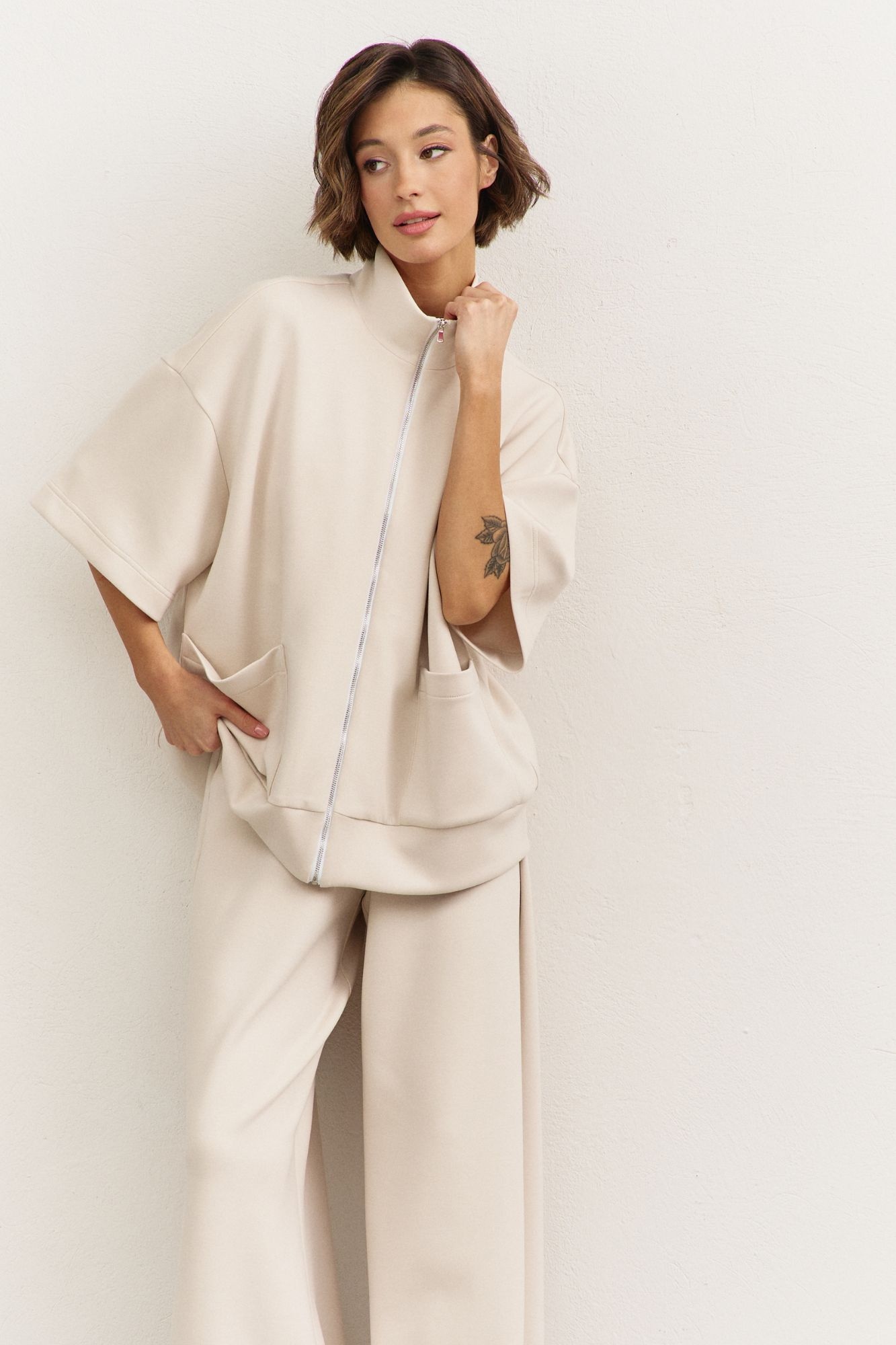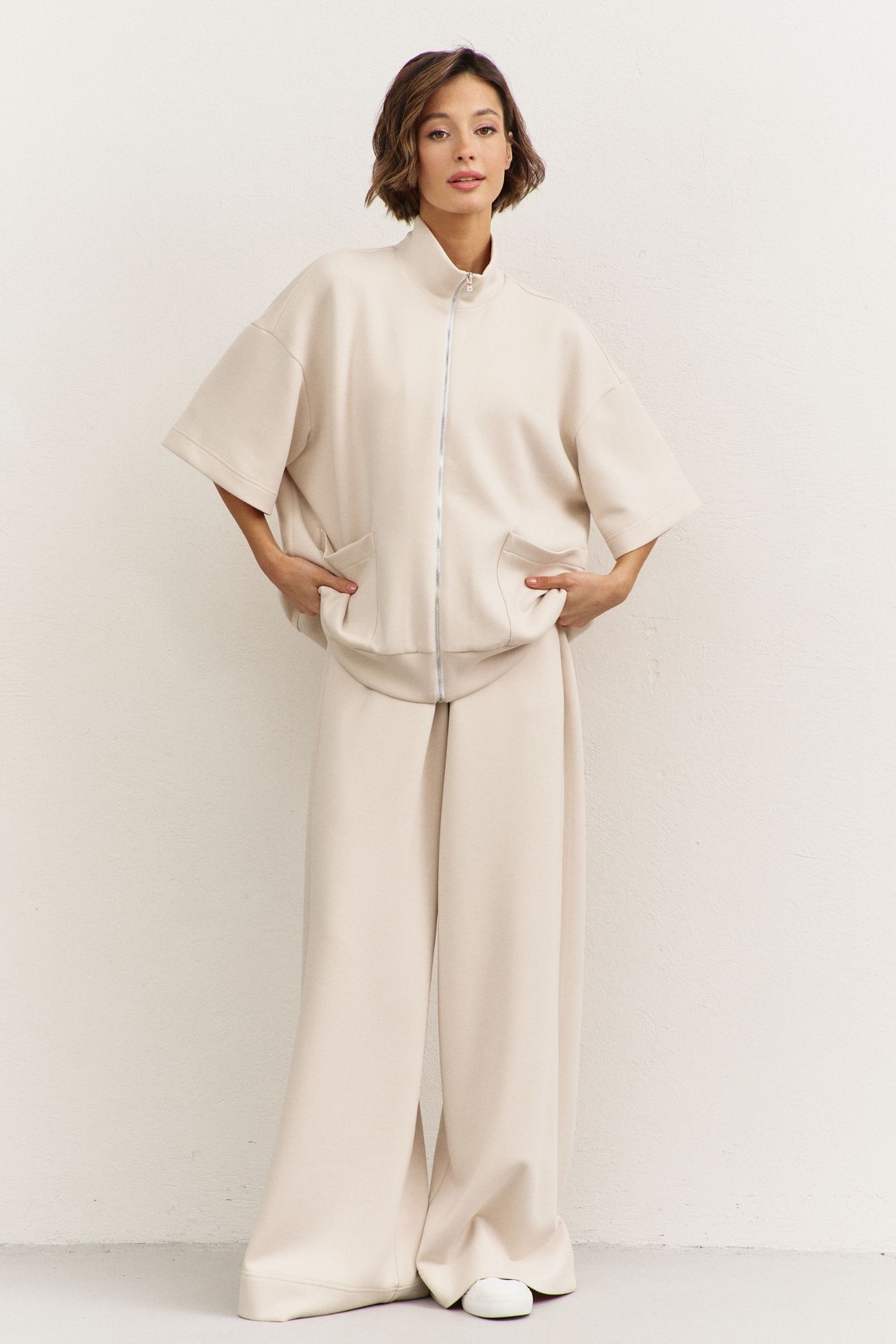 Костюм брючный 1491-1 RINKA — это идеальный выбор для стильных и комфортных образов. Коллекция бренда RINKA сочетает в себе элегантность и удобство. Комплект включает в себя свободную толстовку с воротником-стойкой и застежкой на молнию, а также брюки с притачным поясом на резинке. Изделие выполнено из трикотажной ткани, содержащей 77% вискозы, благодаря чему оно прекрасно дышит и сохраняет форму. Накладные карманы на толстовке и карманы в боковых швах брюк добавляют практичности. Костюм с рукавами 3/4 и спущенной линией плеча идеально подходит для весенне-летнего сезона. Бежевый цвет придаёт образу свежести и утонченности.