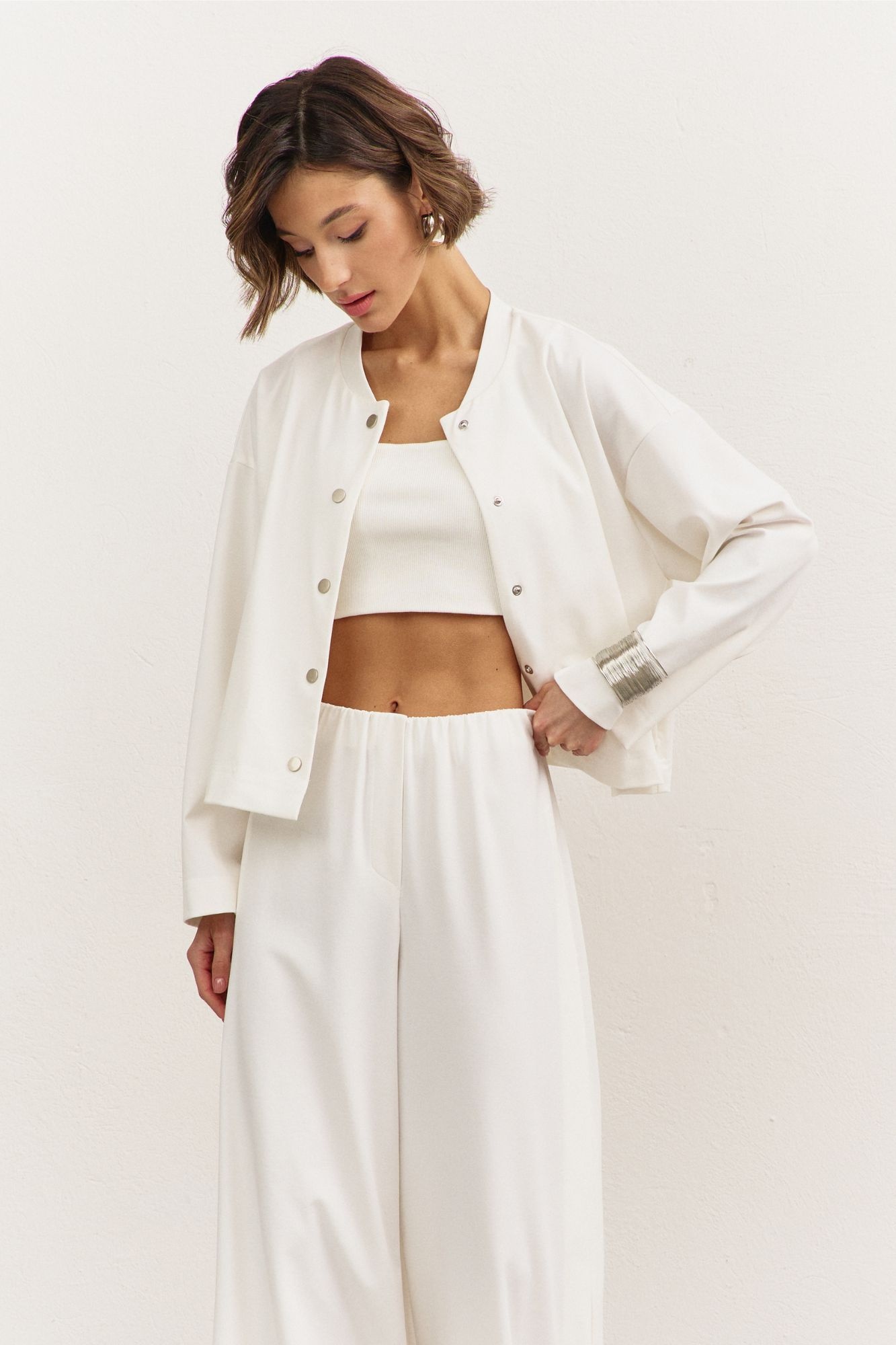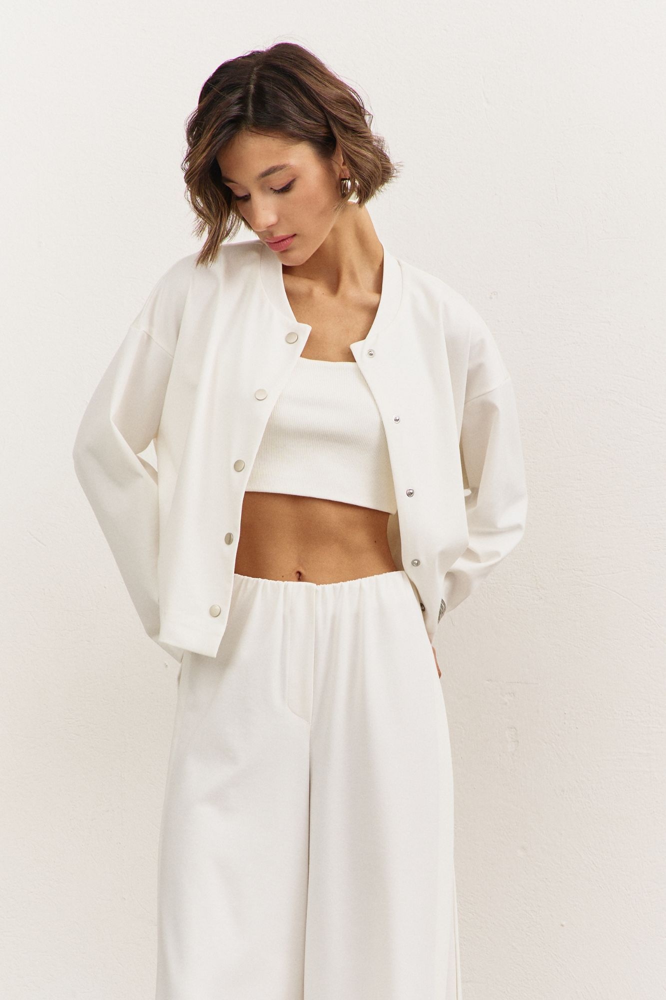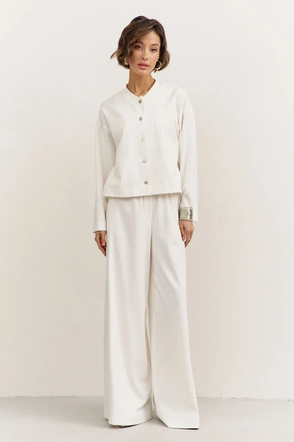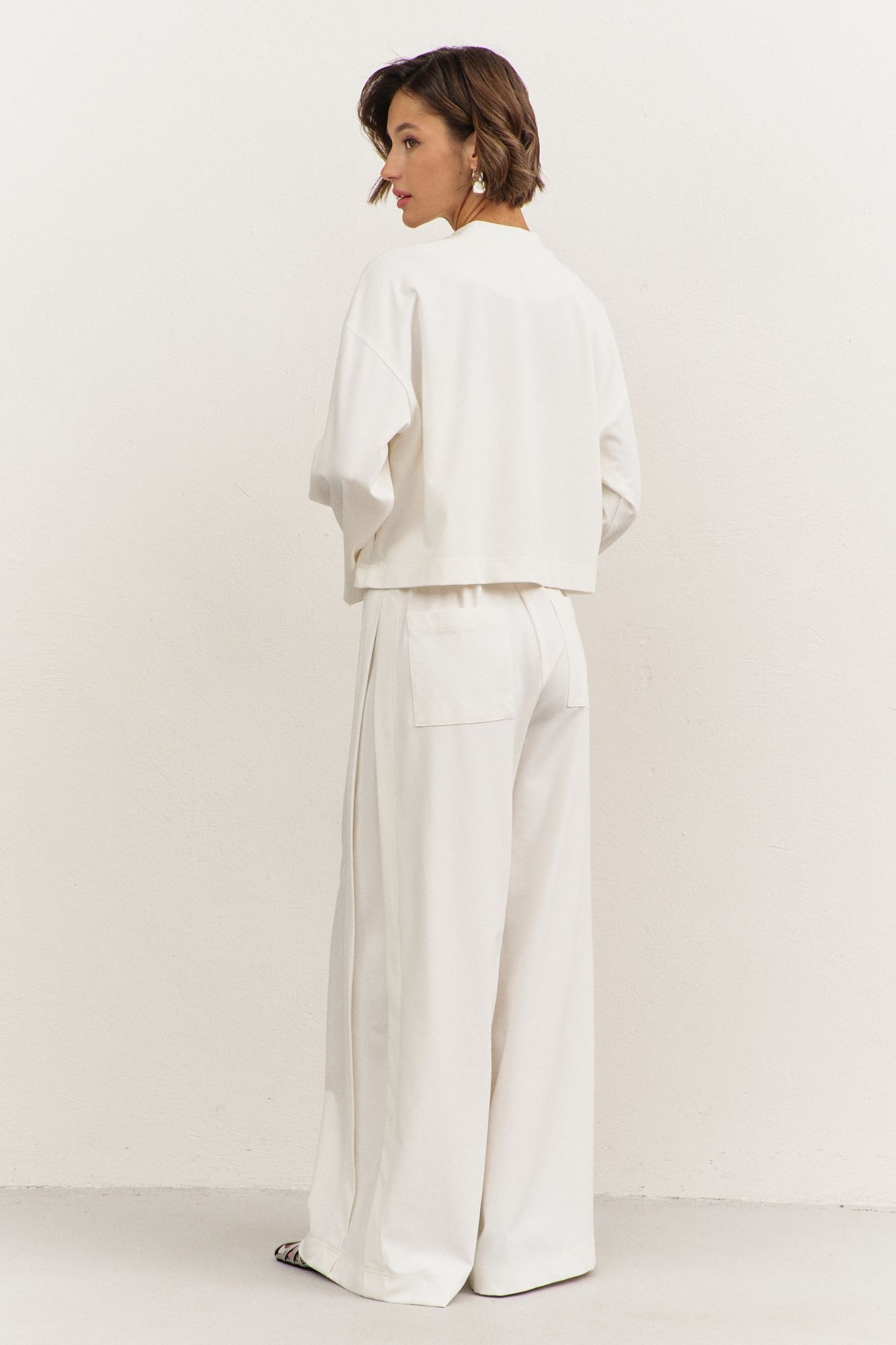 Костюм брючный 1494-1 RINKA — это универсальный комплект из джемпера и брюк от коллекции бренда RINKA. Изготовленный из приятного на ощупь трикотажа (77% вискоза, 15% полиамид, 8% спандекс), этот костюм обеспечивает комфорт и свободу движений. Джемпер свободного кроя с длинными втачными рукавами и застежкой на кнопки дополняет актуальный образ. Спущенная линия плеча придаёт стильный, расслабленный вид. Брюки свободного кроя с цельнокроеным поясом на резинке и декоративным клином в боковых швах подходят для любого повседневного стиля. Накладные карманы на спинке добавляют функциональности. Кремовый оттенок делает комплект идеальным для весеннего и осеннего сезонов, подчеркивая утонченную универсальность костюма.