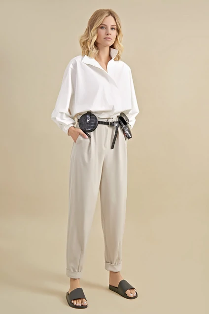 Брюки-бананы высокой посадки, слегка зауженные к низу. Притачной пояс с цельнокроеными шлевками и складками по переду. Застежка на молнию с пуговицей. В брюках имеются функциональные карманы. В комплект ремень не входит.