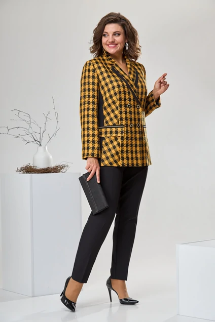 Костюм женский 2-х предметный: жакет и брюки. Жакет женский полуприлегающего силуэта длиной нижелинии бёдер. Перед с двумя талиевыми выточкамис 2-мя отрезнымибочками из отделочной ткани, с 2-мя простороченными клапанами, декорированными отделочной тесьмой.Спинка со средним швонми 2-мя отрезными бочкамииз отделочной ткани. Горловина V-образным вырезом с вточным воротником пиджачного типа, с отложенным лацканом с приточной декоративной планкой из отделочной ткани. Застёжка центральная, 2-х бортная на 3-и обмётанные петли и 4-и пришивные пуговицы. Рукав вточной, 2-х шовный, длинный. Жакет с плечевыми накладками, на подкладке. Брюки женские, длинные, слегка заужены к низу. Передние половинки с карманами в боковых швах. Длина спинки 70 см, длина рукава 61 см, длина брюк по боковому срезу 101 см. Брюки: 91%-ПЭ, 9%-спандекс.