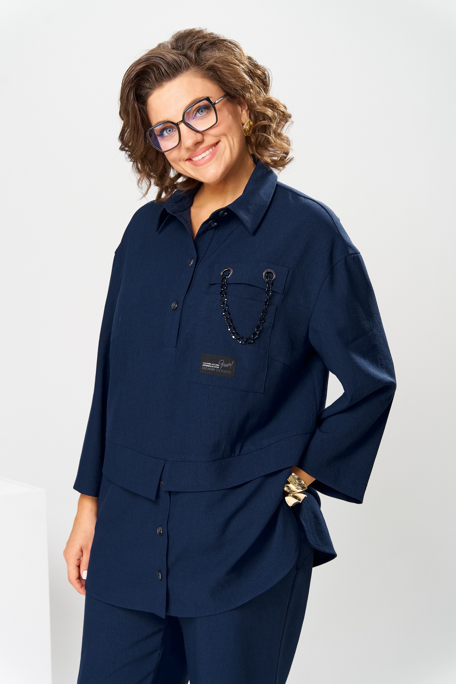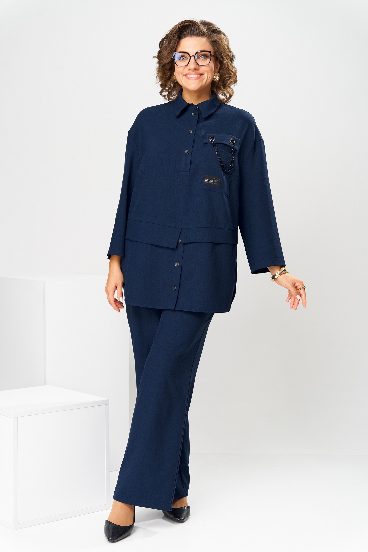 Костюм брючный 2-2554 синий Romanovich style – идеальный выбор для повседневного образа. Коллекция бренда Romanovich style предлагает стильный комплект из блузона и брюк. Выполнен из сочетания полиэстера и вискозы, материал обладает мягкостью и долговечностью. Блузон длиной 78 см, укороченный 7/8 рукав завершают современную форму, длина рукава 45 см.. Декорированный накладной карман с аппликациями и декоративной цепочкой добавляет оригинальности. Эластичный пояс брюк обеспечивает комфортную посадку. Цвет глубокий синий подчеркивает классический стиль костюма. Подходит для офисной и повседневной носки, предлагая универсальный образ в прохладное время года. Длина брюк по боковому шву составляет 101 см.