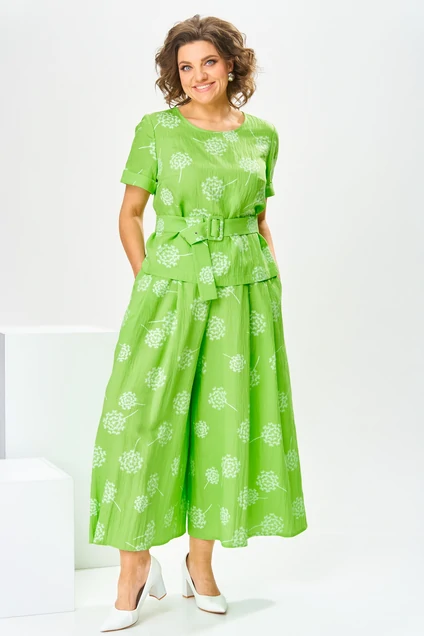 Костюм женский предназначен для повседневной носки. Костюм женский 2-х предметный блузка и юбка-брюки. Блузка женская прямого силуэта, длиной до линии бёдер. Перед с 2-мя нагрудными вытачками. Спинка с отрезной кокеткой, с 1-ной встречной складкой, кокетка декорирована пришивной металлической пластиной. Боковые швы с разрезами. Горловина круглая, обточная, без воротника. Рукав втачной одно шовный, короткий, с приточной отложной манжетой. Блузка без плечевых накладок. Юбка-брюки длинные широкие. Передние половинки с карманами в боковых швах с 2-мя односторонними зафиксированными складками на каждой половинке. Задние без конструктивных особенностей. Пояс притачной, собран на эластичную тесьму, закреплённую 2-мя отделочными строчками. Длина брюк по боковому срезу 90 см. Длина спинки блузона 56 см, длина рукава 22 см.