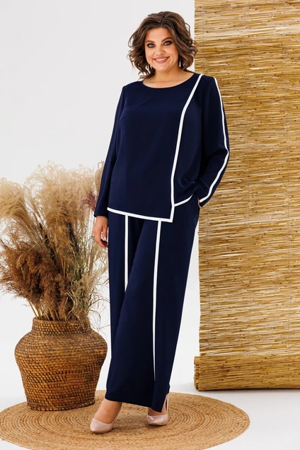 Костюм женский, может использоваться как нарядный, так и для повседневной носки. Костюм женский 2-х предметный блузон и брюки. Блузон прямого силуэта, длиной ниже линии бёдер на 4см с фигурным низом. Перед с 1-ной нагрудной вытачкой, с 1-ним отрезным рельефом, выходящим из плечевого шва. Спинка цельнокроеная. Горловина круглая, обточная, без воротника. Рукав втачной, 2-х шовный, длинный. Шов притачивания рельефа переда, верхний шов рукава обработаны кантом из отделочной ткани, шириной 1,1 см. Блузон с плечевыми накладками. Брюки женские прямые длинные. Передние половинки с карманами в боковых швах, с отлётными деталями с отделочным кантом из отделочной ткани шириной 1,1 см. Задние половинки с таллиевыми вытачками. Брюки с притачным поясом, собранным на эластичную тесьму, закреплённую 2-мя отделочными строчками. Длина брюк по боковому срезу 101 см. Длина спинки блузона 64 см, длина рукава 61 см.