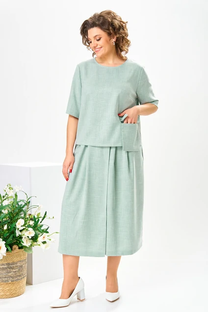 Костюм женский, предназначен для повседневной носки. Костюм женский 2-х предметный, блузон и юбка-брюки. Блузон женский прямого силуэта, длиной выше линии бёдер на 4 см. Перед с 2-мя нагрудными вытачками, с накладным отлётным прямоугольным карманом с клапаном, декорированным надстрочной аппликацией на левой части переда. Спинка цельнокроеная. Горловина круглая, обточная, без воротника. Рукав втачной одно шовный, длиной до локтя. Блузон без плечевых накладок. Юбка-брюки свободного покроя, длиной до нижней части икры. Передние половинки с отлётной отделочной деталью справа имитирующей запах. Передние половинки с карманами в боковых швах с отрезными бочками с 2-мя односторонними складками на линии талии. Юбка брюки с притачным поясом, частично собранным на эластичную тесьму, закреплённую 2-мя отделочными строчками. Длина юбки-брюк 83 см. Длина спинки блузона 53 см, длина рукава 31,5 см.