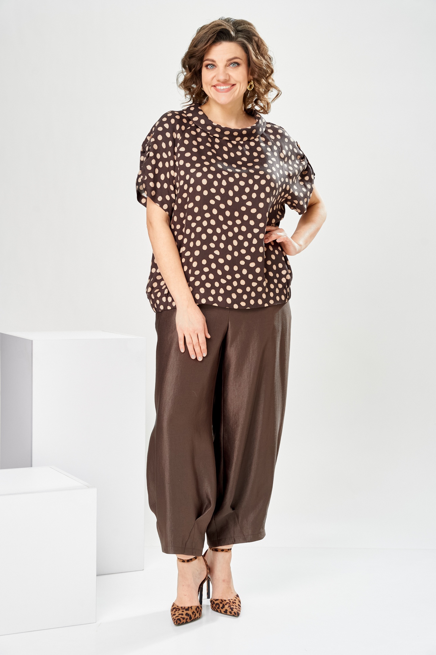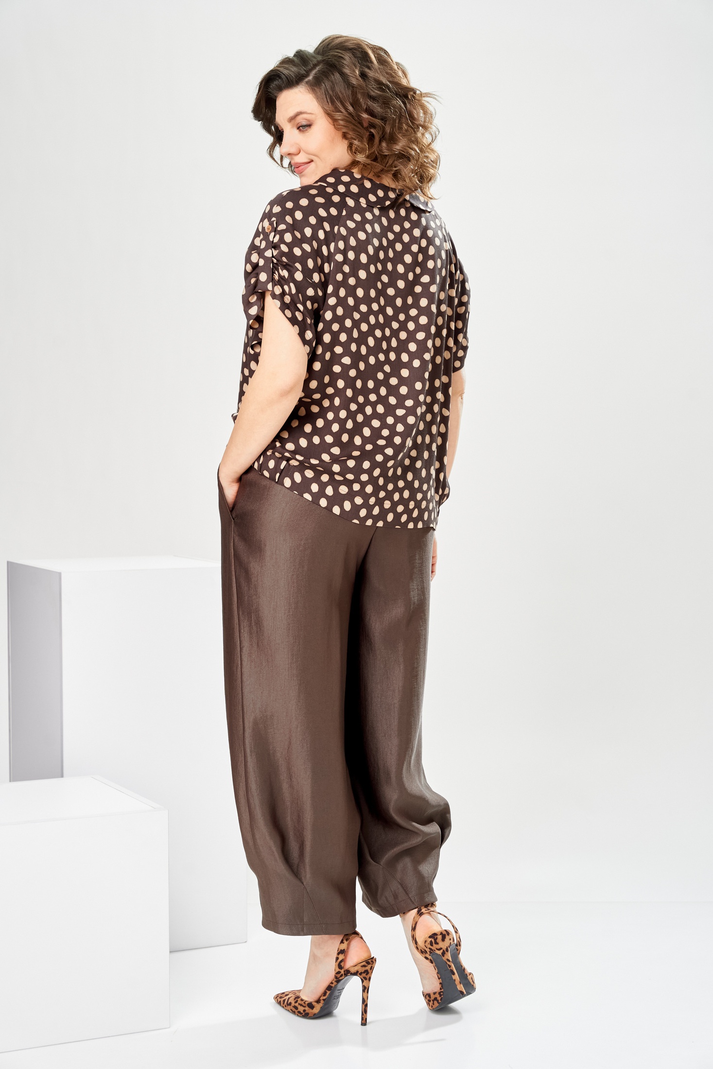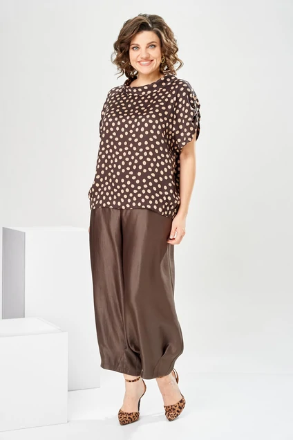 Костюм брючный 2-2924 Romanovich style сочетает в себе повседневный стиль и утонченное исполнение. Коллекция бренда Romanovich style предлагает элегантный женский костюм, состоящий из блузки и накатных брюк. Блузка выполнена из 100% вискозы, что придает легкость и комфорт при носке. Ее круглый воротник и интересные детали, такие как надстрочные хлястики на рукавах, добавляют изюминку. Брюки «аладины» длиной 7/8 с обтачными карманами и эластичной тесьмой на поясе обеспечивают удобство и современный внешний вид. Контрастный дизайн в горошек подчеркивает модный аспект. Длина спинки блузки 62 см, длина рукава 28,5 см, длина брюк по боковому шву 95 см, что идеально подходит для теплой весны или летних прогулок.
