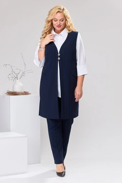 Стильный офисный комплект с брюками для женщин. Костюм синего цвета с длинным жилетом.Комплект женский трех предметный: жилет, блузка и брюки предназначен для повседневной носки. Жилет женский полуприлегающего силуэта. Перед с отрезной планкой по краю борта, с отрезными рельефами, с бочками. На бочках на уровне линии бедер обработаны накладные карманы. Спинка с двумя талиевыми вытачками и средним швом. Горловина V-образная, обтачная, без воротника. Застежка центральная на две навесные петли и две пришивные пуговицы. Боковые швы с разрезами. Жилет на подкладке. Блузка женская прямого силуэта, длиной до линии бедер. Перед с двумя нагрудными вытачками, с двумя цельнокроеными планками. Спинка с двумя талиевыми вытачками. Горловина круглая, с воротником рубашечного типа, с отрезной стойкой. Рукав втачной, двухшовный, длиной 3\4, с притачной манжетой, фиксирующейся на две обметанные петли и две пришивные пуговицы. Застежка центральная на десять обметанных петель и десять пришивных пуговиц. Блузка с плечевыми накладками. Брюки женские, длинные, слегка заужены к низу. Передние и задние половинки с двумя талиевыми вытачками. Застежка на тесьму-молнию. Верхний срез с притачным поясом, застегивающимся на одну обметанную петлю и одну пришивную пуговицу. Между вытачками задних полотнищ и боковыми швами пояс собран на эластичную тесьму. Длина спинки жилета 94 см. Длина блузки 71 см. Длина рукава 47 см. Длина брюк 102 см Блузка – (текстиль) полиэстер 68%, вискоза 28%, спандекс 4%