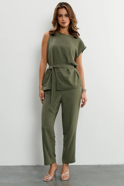 Стильный костюм с брюками и топом на одном плече. Этот с брюками и топом на одном плече — идеальный выбор для тех, кто ценит элегантность и комфорт. Изготовлен из высококачественного материала, он обеспечивает максимальный комфорт и стиль. Костюм включает в себя брюки и топ с асимметричным кроем, который подчеркивает силуэт и делает вас уверенной и привлекательной.
