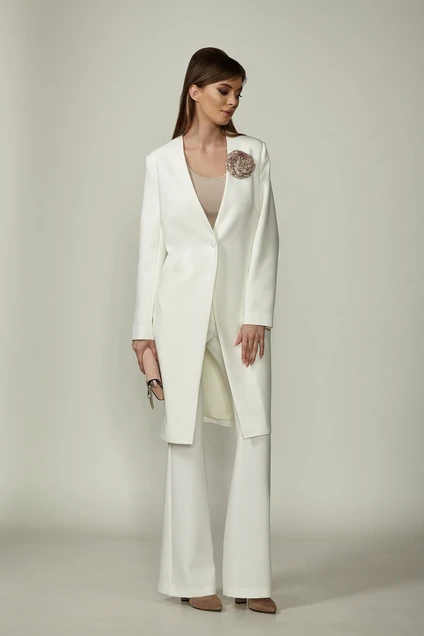 Брючный комплект из костюмной ткани на подкладке. Жакет прямого силуэта с двумя наклонными вытачками и карманами в боковых швах. Рукава - длинные, двухшовные. Жакет застегивается на 1 пуговицу. Цветок ручной работы в виде пиона станет украшением комплекта. Брюки - клеш расширены к низу, с началом расширения выше колена 5 см. Брюки с двумя карманами округлой формы и поясом-обтачкой. Застегиваются на молнию по переду и одну пуговицу. Цвет молоко.