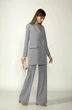 Брючный комплект из костюмной ткани на подкладке. Двубортный жакет выполнен в стиле оверсайз. Воротник-с отложными лацканами пиджачного типа, рукава – двухшовные. По переду- прорезные карманы с клапанами. Жакет имеет два ряда пуговиц, застегивается на две основные пуговицы, одну потайную, остальные пуговицы несут декоративный характер. Брюки прямые со складкой, широким поясом-обтачкой, наклонными карманами. Застегиваются на молнию по переду и пуговицу. Цвет серый.