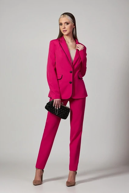 Классический брючный костюм из костюмной ткани на подкладке. Жакет приталенного силуэта с прорезными карманами с клапанами по переду. Воротник-английский, рукава - двухшовные. Кант по краю борта, клапанам добавит стиля и элегантности. Застегивается на две пуговицы. Брюки слегка заужены к низу, с поясом. Застегиваются на молнию по переду и одну пуговицу. Цвет фуксия.