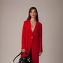 Комплект женский, состоящий из жакета и брюк, выполнен из стрейчевой костюмной ткани на подкладке. Жакет полуприталенного силуэта с рельефами по переду и спинке, отрезной по линии талии, с баской. Карманы-эмитация. Воротник - пиджачного типа. Рукава - втачные, двухшовные. Застежка на 2 пуговицы. Съемная брошь-цветок входит в комплект. Брюки слегка заужены к низу, с поясом. Застегиваются на молнию по переду и одну пуговицу.