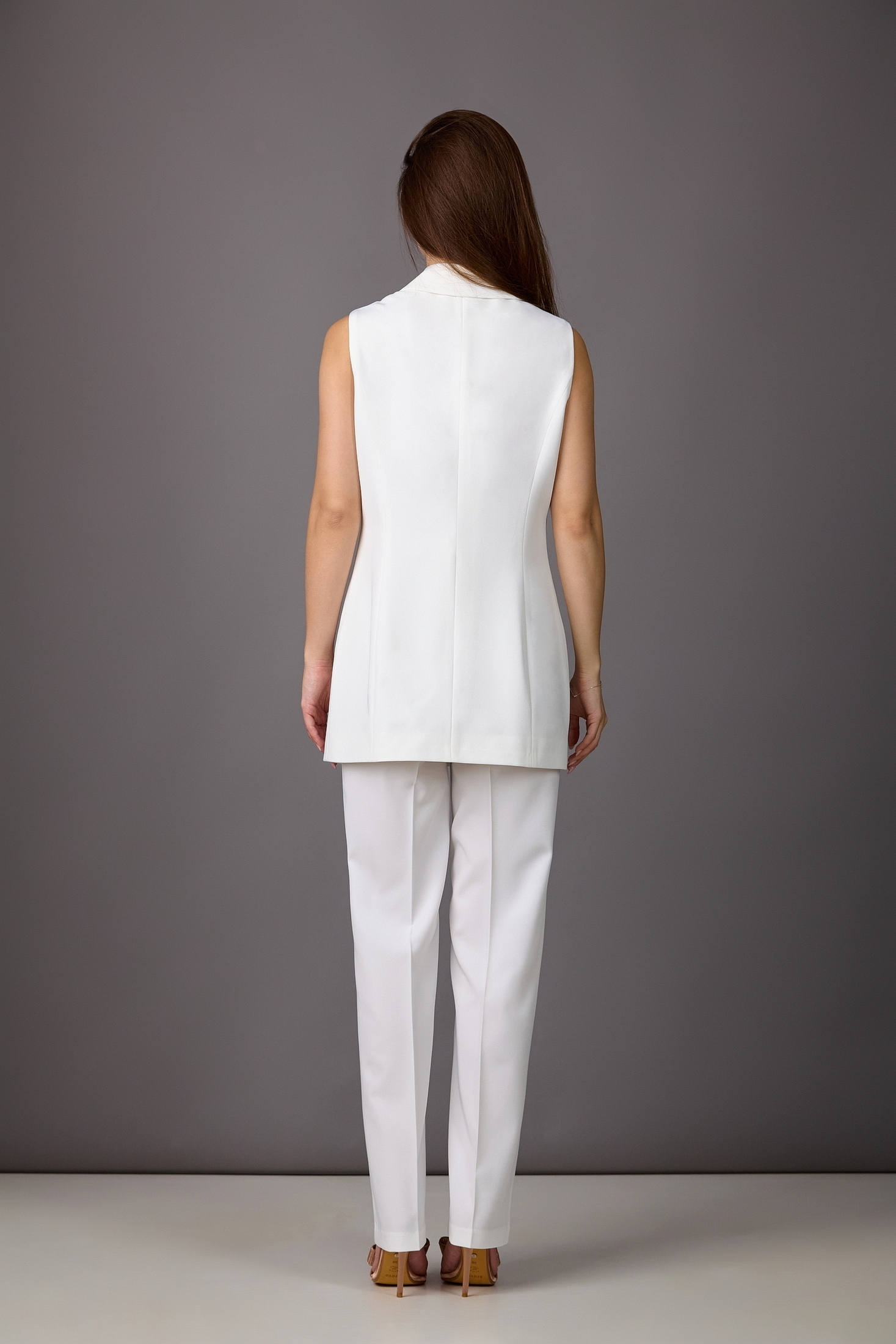 Комплект из костюмной ткани на подкладке, состоящий из жилета и брюк. Жилет приталенного силуэта с прорезными карманами с клапанами по переду. Воротник-английский, рукава - двухшовные. Застегивается на две кнопки. По жилету пришивная аппликация из черного кружева.Брюки прямого силуэта с наклонными карманами и поясом. Величина пояса регулируется резинкой. Застегиваются на молнию пуговицу по переду.
