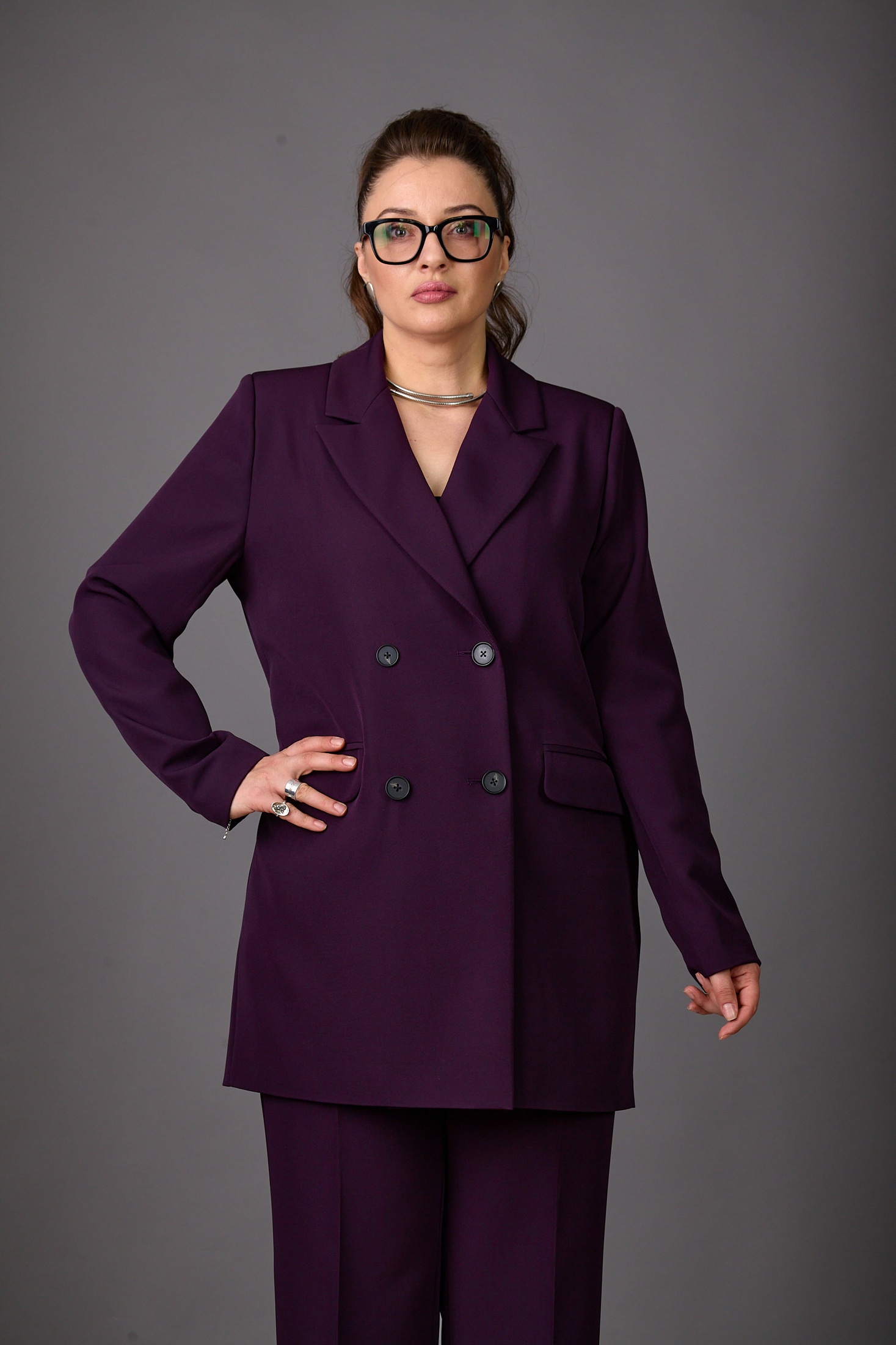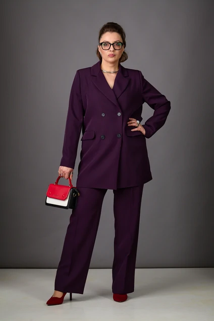 Костюм брючный 1187 баклажан Rosheli — это великолепный выбор для современного гардероба. Коллекция бренда Rosheli предлагает костюм из стрейчевой костюмной ткани в насыщенном баклажановом цвете. Двубортный жакет прямого силуэта с воротником с лацканами и втачными длинными рукавами. Застежка на пуговицы и карманы с клапанами делают этот образ стильным и удобным. Брюки средней посадки с прямыми штанинами, молнией и застежкой на пуговицу, а также регулируемый резинкой пояс, добавляют комфорта. Этот костюм идеально подходит для осеннего или весеннего сезонного гардероба, а также для деловой или офисной обстановки.