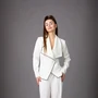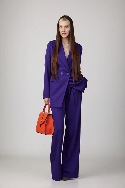 Брючный комплект из костюмной ткани на подкладке. Двубортный жакет полуприталенного силуэта с отрезными бочками и вытачками по переду и спинке. Воротник-с отложными лацканами пиджачного типа. По переду - прорезные карманы с клапанами. Рукава длинные, двухшовные. Жакет застегивается на две пуговицы. Брюки прямые со складкой, широким поясом-обтачкой, наклонными карманами. Застегиваются на молнию по переду и пуговицу. Цвет фиолетовый.