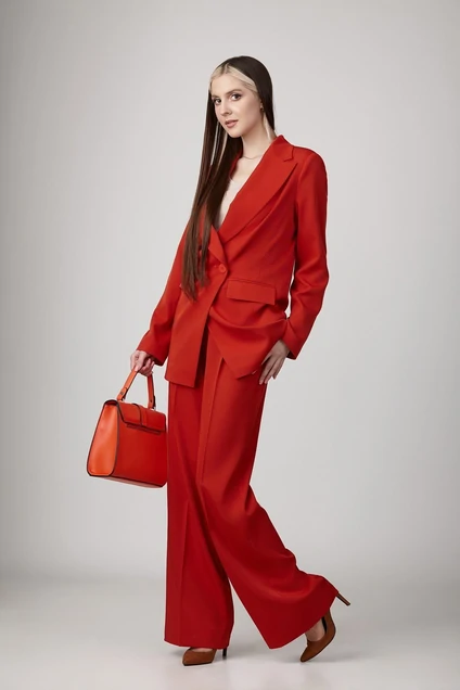 Брючный комплект из костюмной ткани на подкладке. Двубортный жакет полуприталенного силуэта с отрезными бочками и вытачками по переду и спинке. Воротник-с отложными лацканами пиджачного типа. По переду - прорезные карманы с клапанами. Рукава длинные, двухшовные. Жакет застегивается на две пуговицы. Брюки прямые со складкой, широким поясом-обтачкой, наклонными карманами. Застегиваются на молнию по переду и пуговицу. Цвет терракотовый.