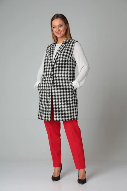 Комплект: жилет, брюки. Жилет прямого силуэта с застёжкой на одну пуговицу. Перед с нагрудными выточками. Жилет с боковыми карманами. Брюки на трикотажном поясе. По задней части - на эластичной резинке, по передней полке застежку на петлю-пуговиц