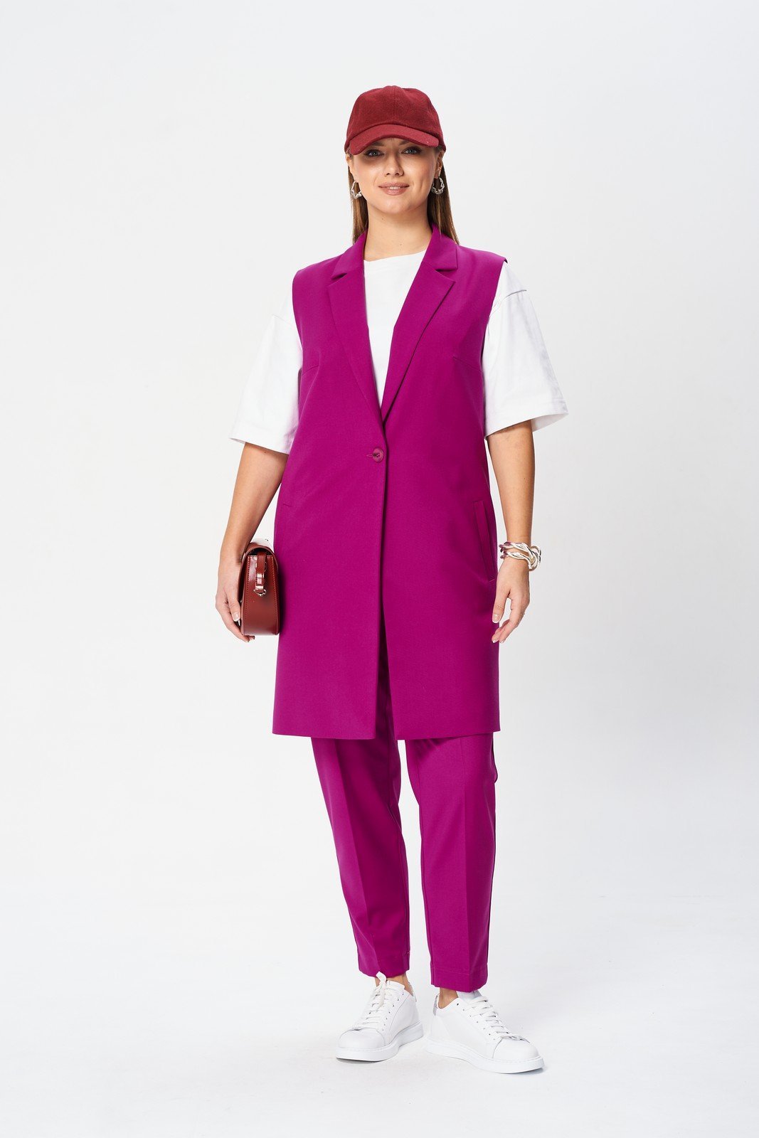 Комплект: жилет, брюки. Жилет прямого силуэта с застёжкой на одну пуговицу. Перед с нагрудными выточками. Жилет с боковыми карманами. Брюки на трикотажном поясе. По задней части - на эластичной резинке, по передней полке застежку на петлю-пуговицу.