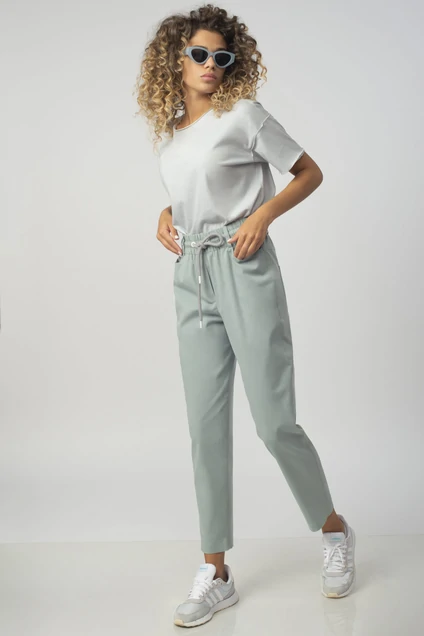 Комплект футболка и брюки. Футболка из хлопкового трикотажного полотна. Прямого силуэта, плечо спущенное. Горловина и низ рукавов обработаны бейкой с открытым срезом. Рукав с открытым срезом. Брюки с имитацией застежки. По талии резинка в поясе. Пояс со шнуром и наконечниками. По передним половинкам карманы с отрезными бочками, по задним половинкам кокетка и накладные карманы.