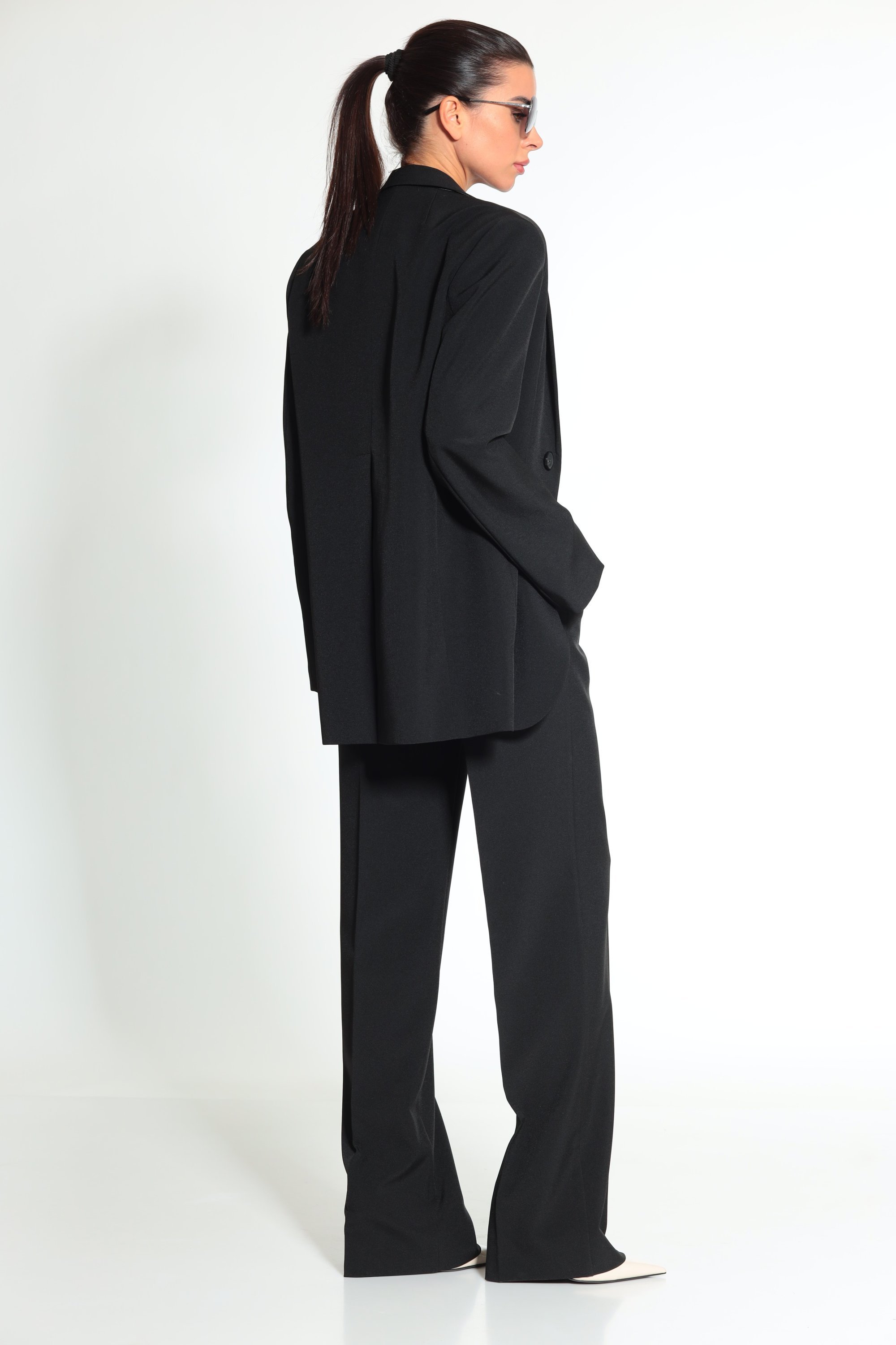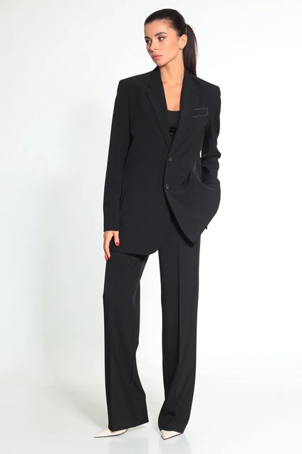 Костюм выполнен из высококачественной синтетической ткани c эластаном, изделие из данного материала прослужит очень долго и не потеряет яркости и презентабельного внешнего вида. Длина жакета по среднему шву спинки 77см. Длина рукава 62 см. Длина брюк по боковому шву с поясом 111 см. Ширина брюк по низу 24 см.