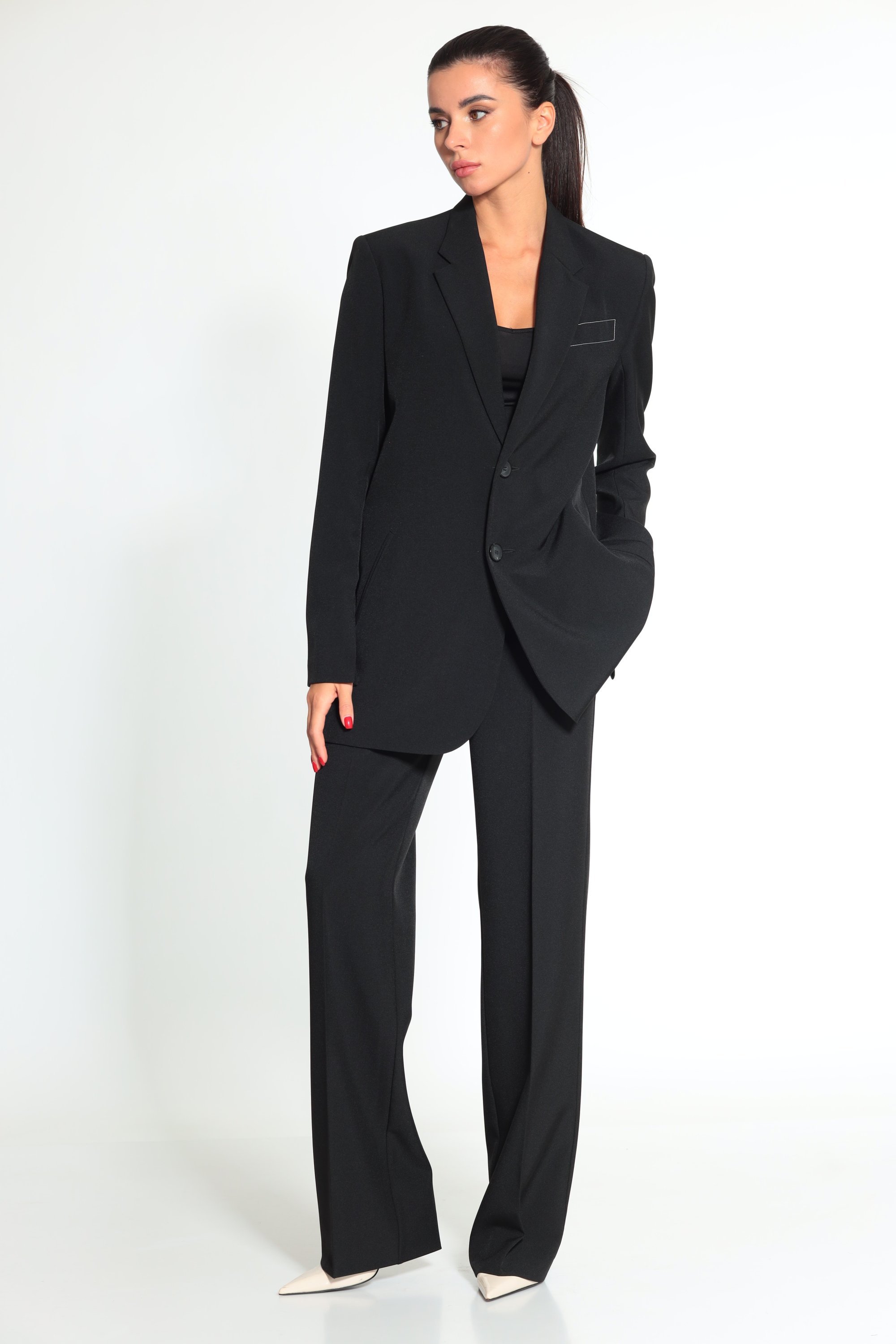 Стильный брючный костюм. Стильный женский жакет современного прямого силуэта, на подкладке. Воротник пиджачного типа с отложным лацканом, нижний воротник из отделочной ткани - эко-кожи. Спереди прорезные карманы в рамку, на левой стороне полочки жакета вышивка контрастными нитками, имитирующая листочку. Спинка со средним швом и высокой отлетной шлицей ( 38 см ).