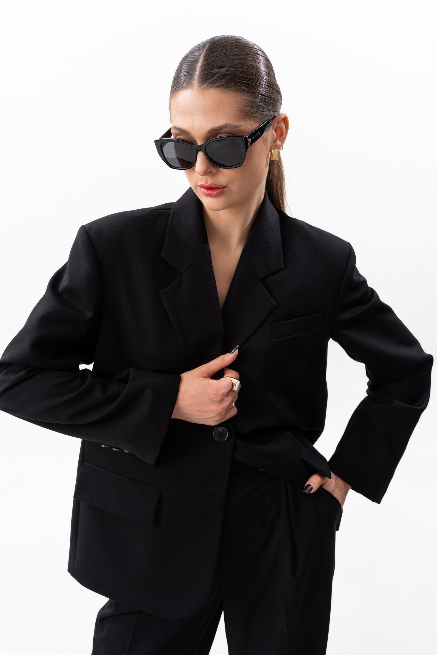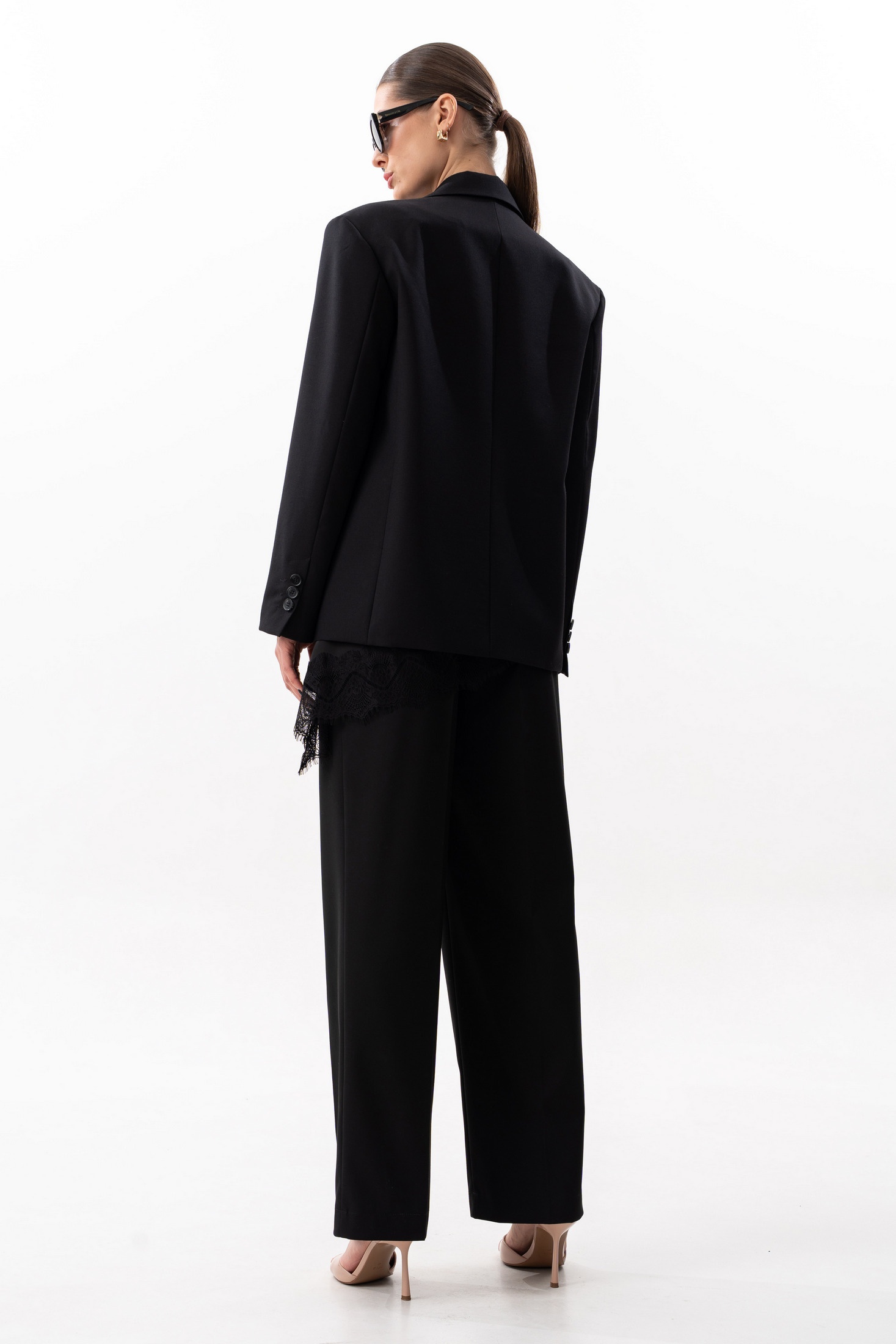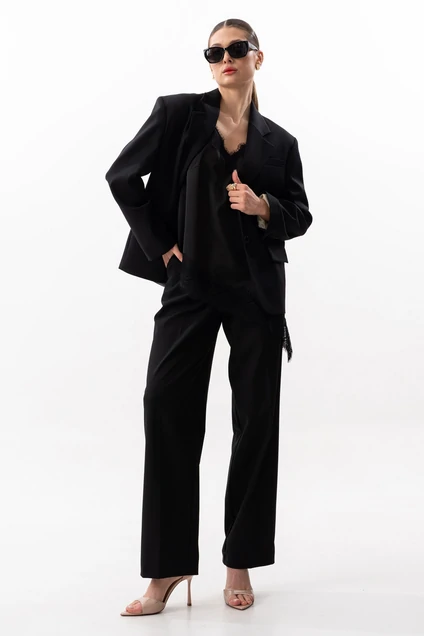Костюм брючный 1634 черный SILVERSPICE — идеальное решение для делового гардероба. Коллекция бренда SILVERSPICE сочетает стиль и комфорт в одном изделии. Костюм выполнен из полиэстера с вискозой, благодаря чему материал мягкий на ощупь и сохраняет форму. Жакет прямого силуэта с увеличенной линией плеч, отложным лацканом и карманами с клапаном подчеркивает классический стиль. Брюки свободной посадки слегка заужены к низу, что создает актуальный силуэт. Цвет костюма — черный, подходит для любого сезона. Длина брюк по боковому шву с поясом составляет 107 см, жакета по среднему шву спинки — 68 см. Эта модель подходит для офисных встреч и формальных мероприятий.