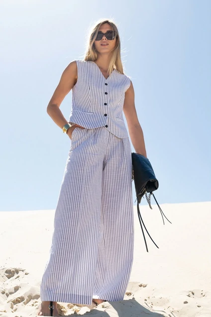 Стильный брючный комплект, состоящий из укороченного жилета и брюк. Жилет приталенного силуэта с нагрудной вытачкой, талиевыми вытачками и средним швом по спинке, на подкладке из хлопкобумажной ткани. Спереди прорезные карманы обманки, застежка центральная на петли - пуговицы. По переду фигурная линия низа. Брюки актуального, расширенного силуэта к низу. На передних половинках заутюжены стрелки, переходящие в складки по линии талии. Застежка-гульфик, по переду боковые наклонные карманы. Пояс стабильный по переду, по задней части брюк на резинке, с настроченными шлевками и застежкой на пуговичку. Комплект выполнен из льняной ткани, стильный и отличный вариант на лето. Длина жилета по среднему шву спинки 50,5 см Длина брюк по боковому шву с поясом 109 см. Ширина брюк по низу (в полуобхвате) +- 33 см.