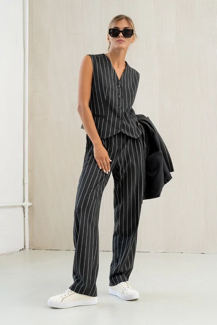 Стильный комплект, состоящий из укороченного жилета и брюк. Жилет приталенного силуэта с нагрудной вытачкой, талиевыми вытачками и средним швом по спинке, на подкладке. Спинка выполнена из вискозной подкладочной ткани. Спереди прорезные карманы обманки, застежка центральная на петли - пуговицы. По переду фигурная линия низа. Брюки актуального силуэта, свободные, слегка заужны к низу. На передних половинках заутюжены стрелки, переходящие в складки по линии талии. Застежка-гульфик, по переду боковые наклонные карманы. Пояс стабильный по переду, по задней части брюк на резинке, с настроченными шлевками и застежкой на пуговичку. Длина жилета по среднему шву спинки 50,5 см. Длина брюк по боковому шву с поясом 108 см.