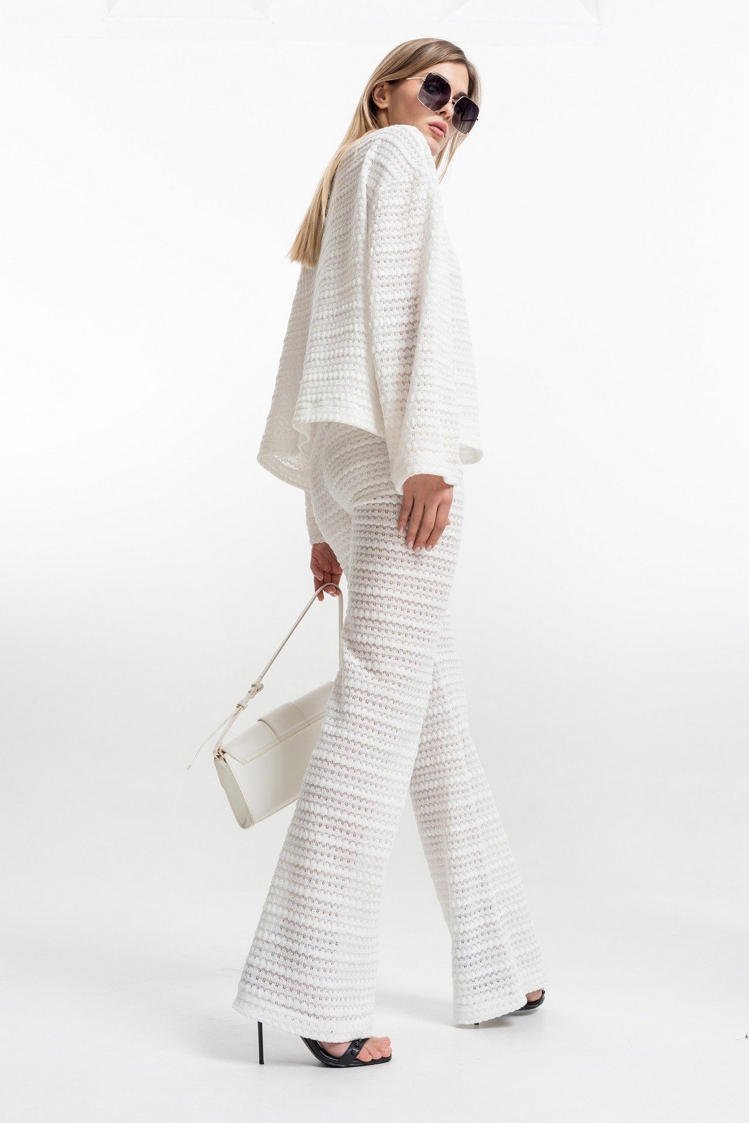 Комплект из фактурного, "вязаного" трикотажа. Джемпер оверсайз с длинным рукавом на спущенной пройме. Горловина округлой формы, обработана бейкой. Брюки облегающего силуэта, слегка расклешенные к низу от линии колена. Изделие с поясом на резинке. Полупрозрачная "вязаная" текстура трикотажа делает образ стильным и романтичным. Комплект идеально подходит как для вечерних, так и для повседневных стильных образов. Длина брюк по внутреннему шву 86 см. ( по боковому шву с поясом 115 см. ) Длина джемпера по центру спинки +-55см. Длина рукава от горловины 66см. ( длина рукава от проймы 52 см.) Ширина горловины 30 см. Ширина по низу в полуобхвате +-66см. ( 46р ) Ширина рукава в полуобхвате +-20 см. ( 46р. )