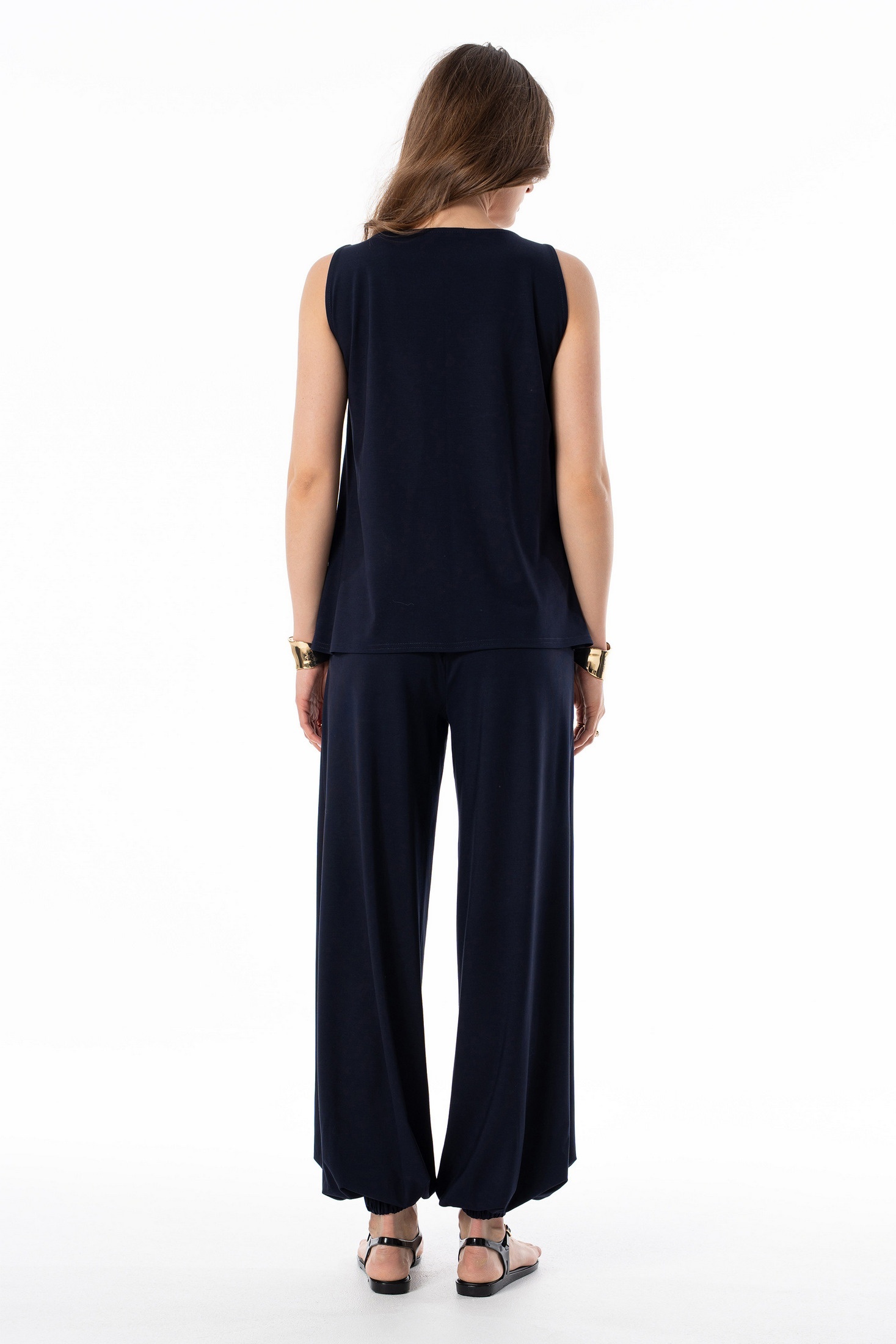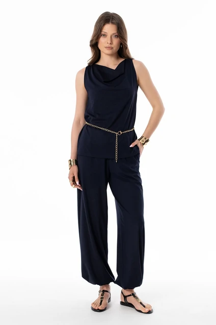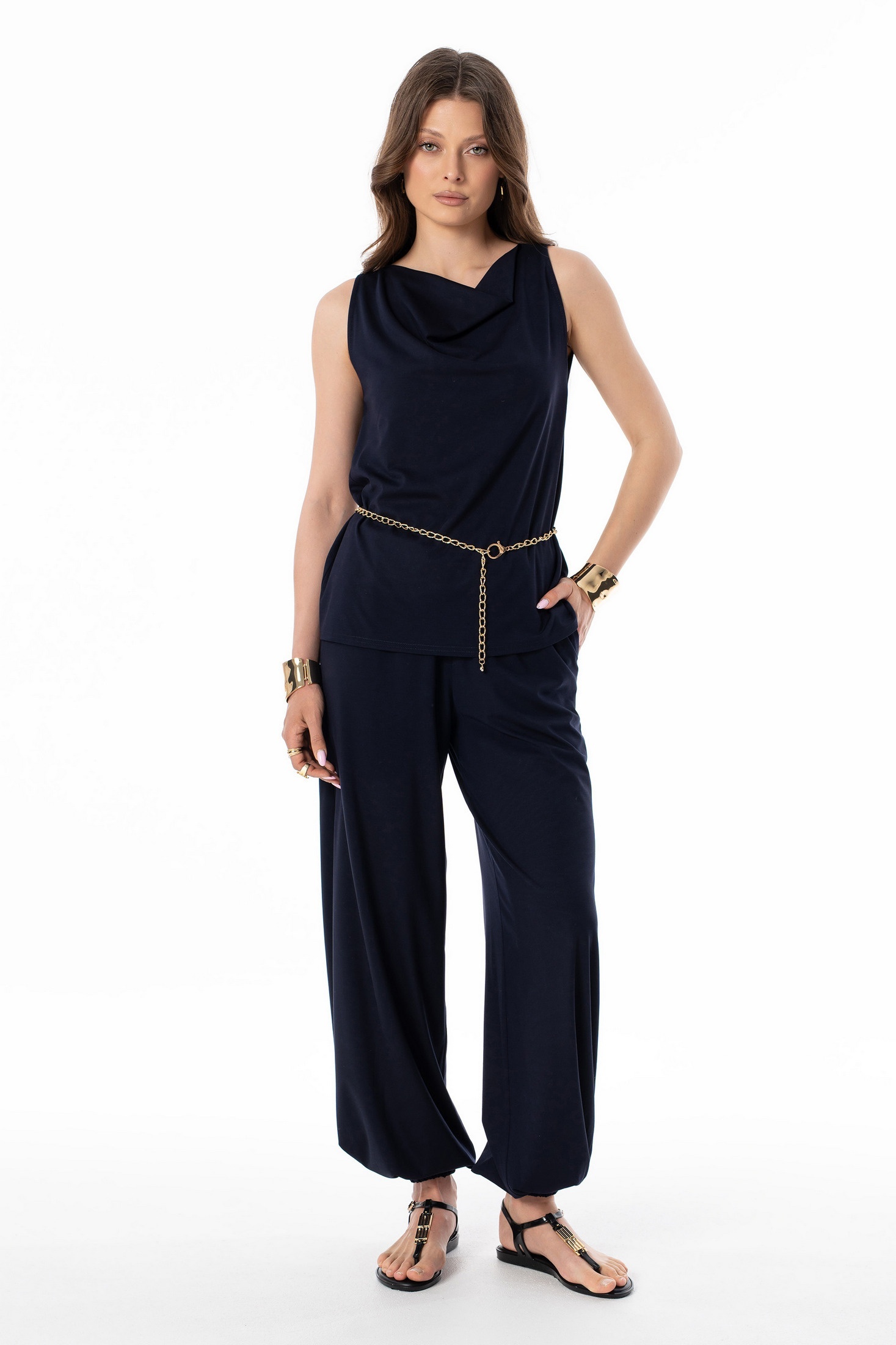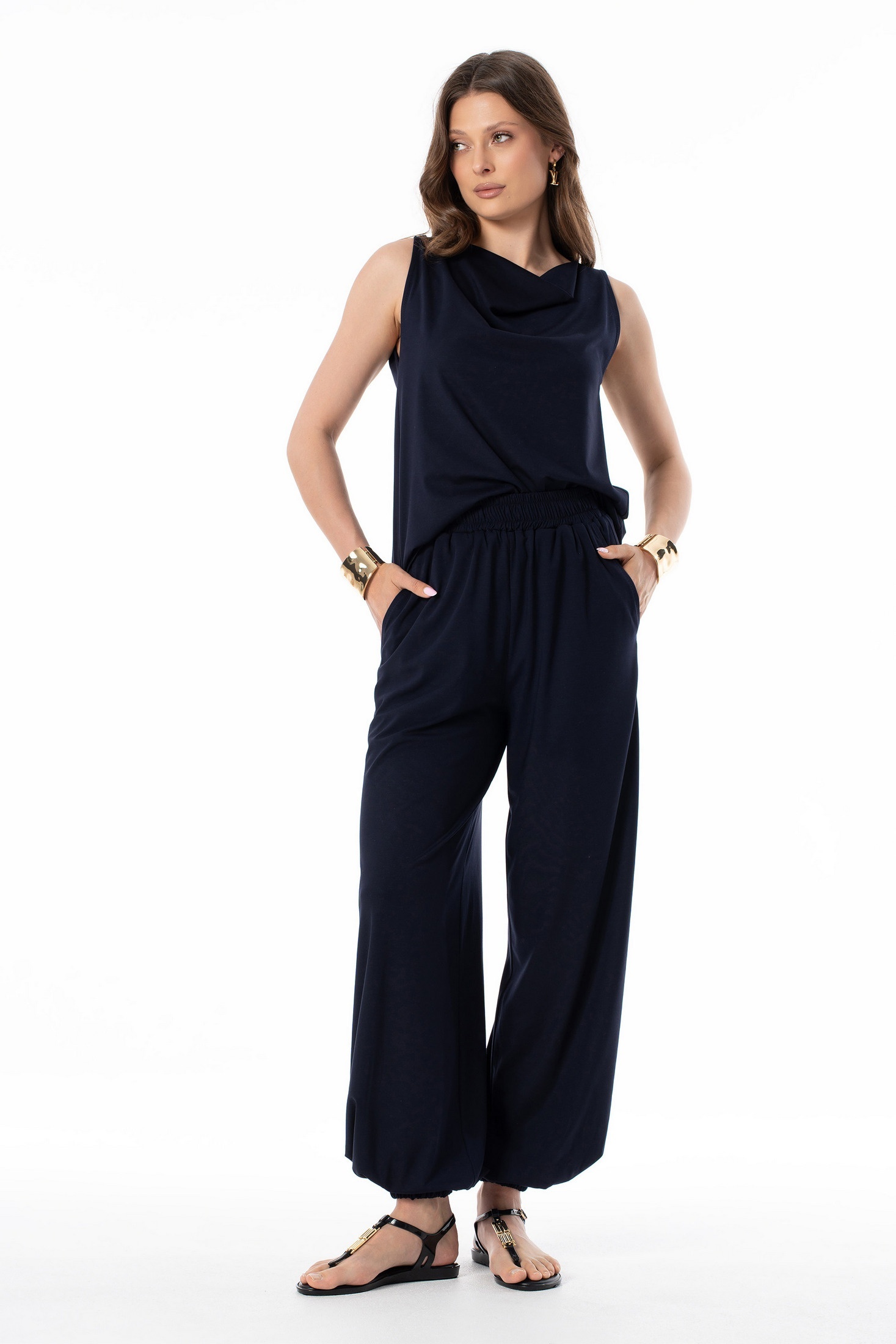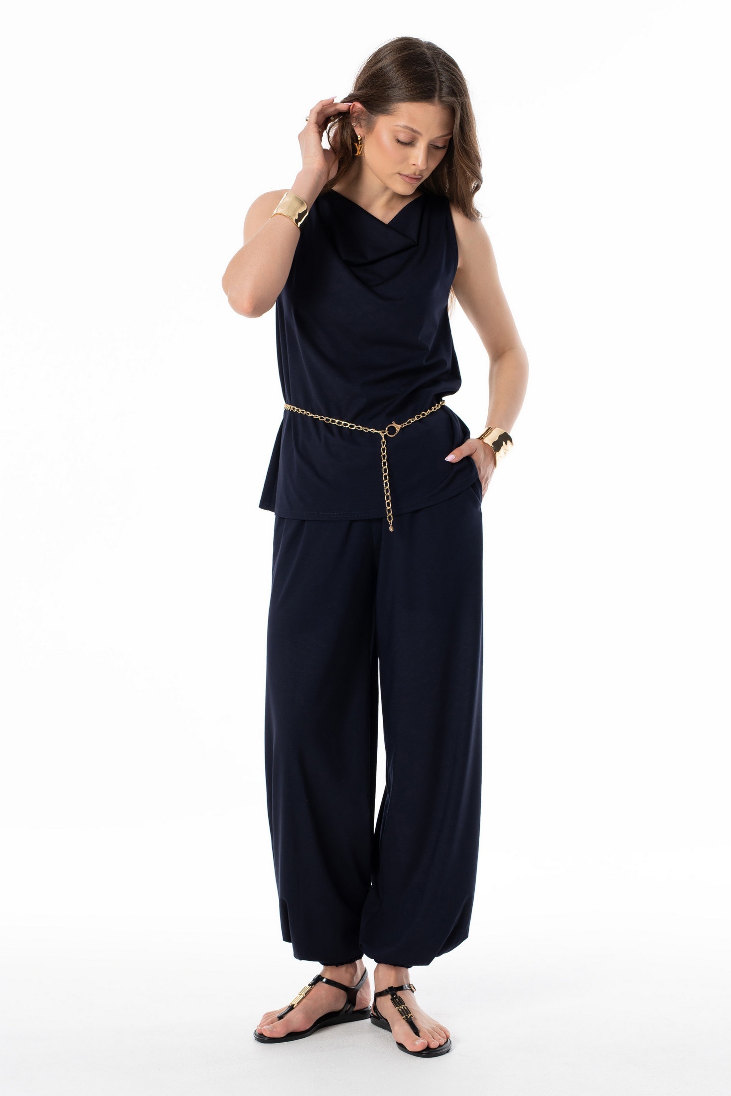 Костюм брючный 8668 SILVERSPICE — это элегантный комплект для стильных девушек. Коллекция бренда SILVERSPICE сочетает в себе комфорт и изысканность. Изготовлен из премиального трикотажного полотна 'Элит', костюм дышащий и приятный к телу. Блузка прямого кроя с асимметричной горловиной идеально подчеркивает стильный образ. Брюки-алладины с широкими штанинами и резинкой на поясе обеспечивают максимальный комфорт. Боковые наклонные карманы добавляют практичности. Отлично подойдет как для вечерних, так и для повседневных выходов в свет. Длина блузки по центру спинки составляет 60 см, длина брюк с поясом около 106 см. Комплект доступен в универсальном тёмно-синем цвете, подчеркивающем индивидуальность каждой женщины.