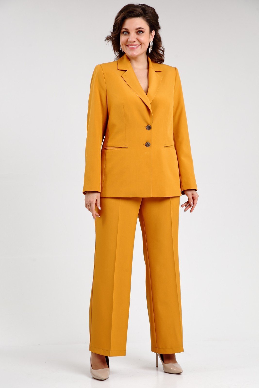 Костюм женский двухпредметный, состоящий из жакета и брюк. Жакет полуприлегающего силуэта с центральной бортовой застежкой на 2 петли-пуговицы до линии перегиба лацкана, с прорезными карманами в рамку. Спинка со средним швом. Рукав втачной двухшовный. Воротник пиджачного типа. Брюки классического силуэта с заутюженными кантами и приточным поясом на резинке по задним половинкам брюк. И застежкой на тесьму молнию и на 1петлю - пуговицу по поясу. И дополнение этого костюма является набедренная косынка, что делает этот костюм очень элегантным. Длина жакета по спинке 71см. Длина рукава 65см. Длина брюк 105см.