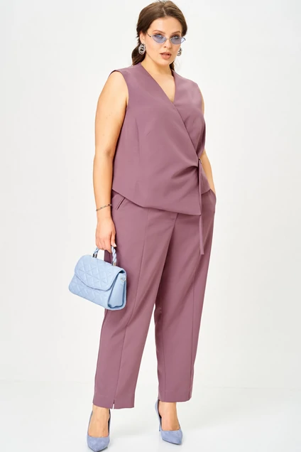 Костюм брючный 11321 SOVA представляет собой изящное сочетание современного дизайна и функциональности. Коллекция бренда SOVA воплощает новую классику в виде стильного двубортного жилета с застежкой на полукольцах для удобной регулировки посадки. Брюки-палаццо со складками и эластичным поясом на резинке обеспечивают комфорт и свободу движений. Изготовленный из смеси полиэстера и вискозы с добавлением эластана, костюм идеально подойдет для офисного и нарядного выхода в любое время года. Приятный фиолетовый оттенок подчеркнет вашу индивидуальность и позволит комбинировать костюм с различными аксессуарами.