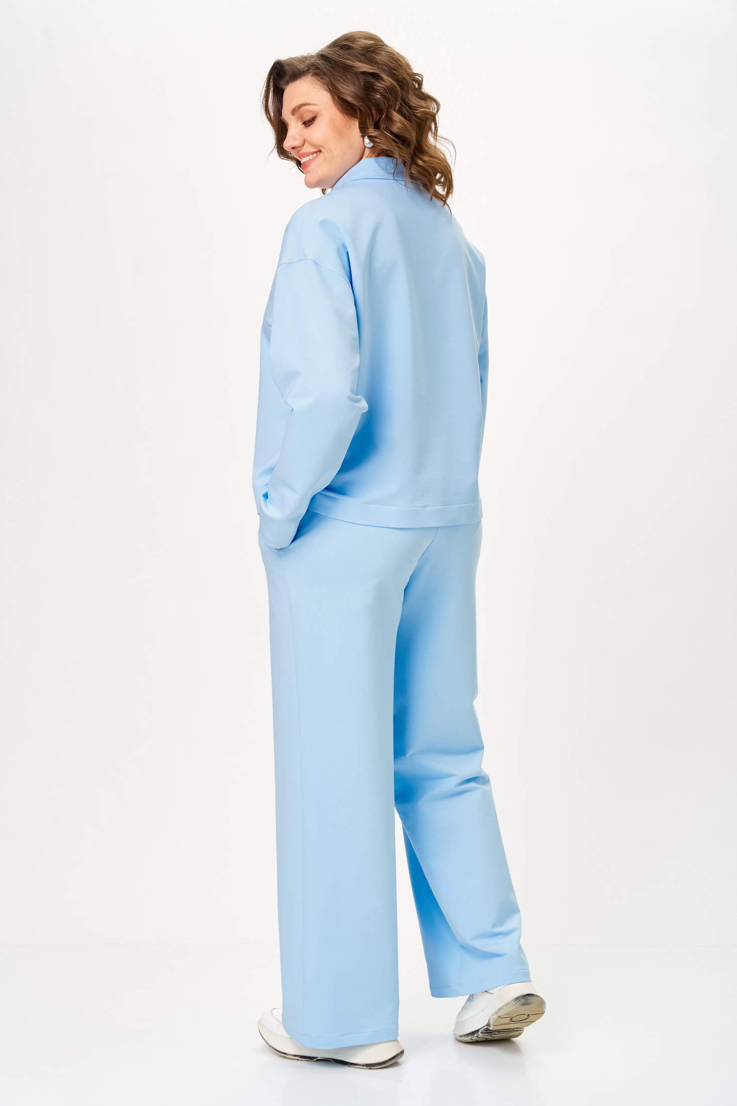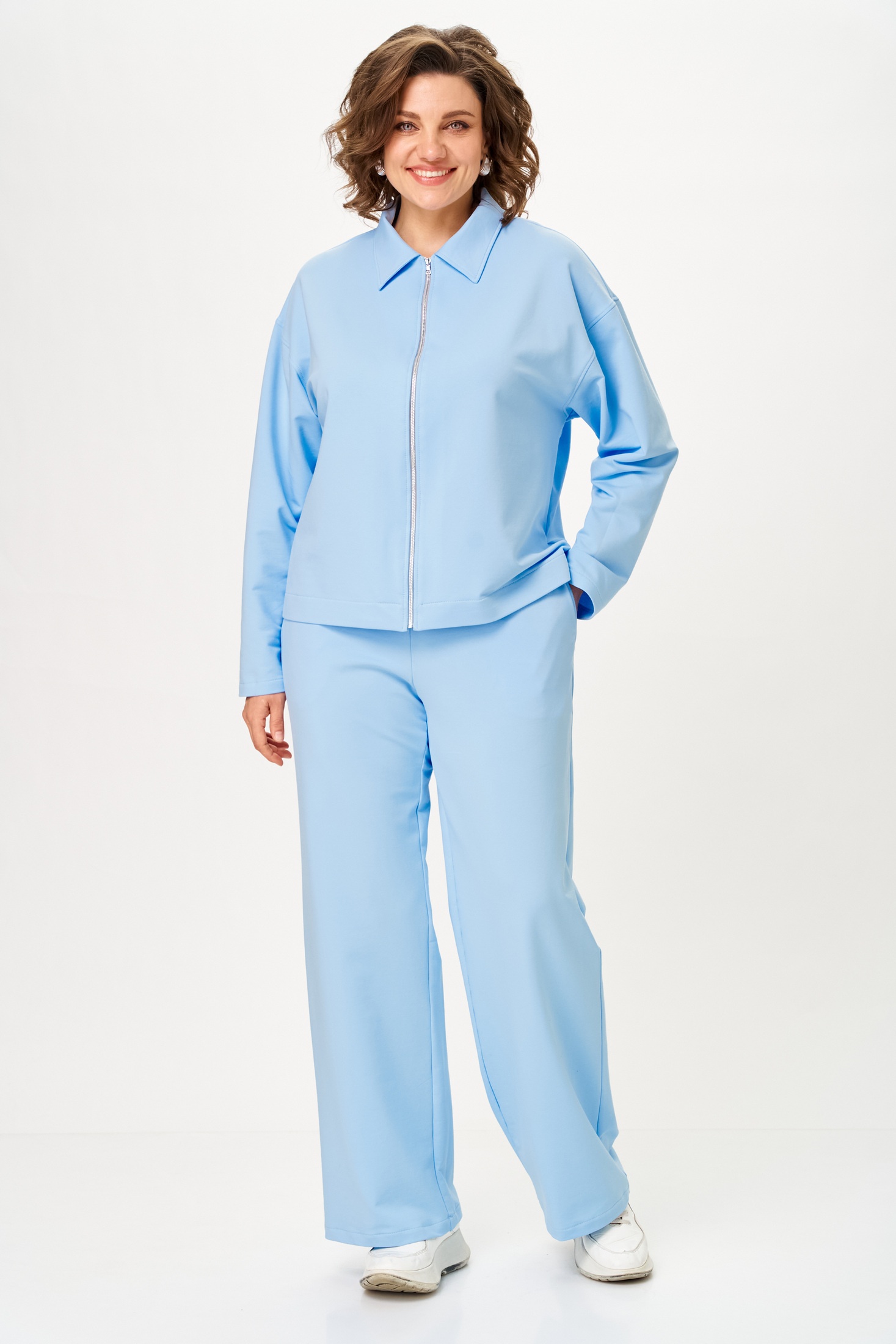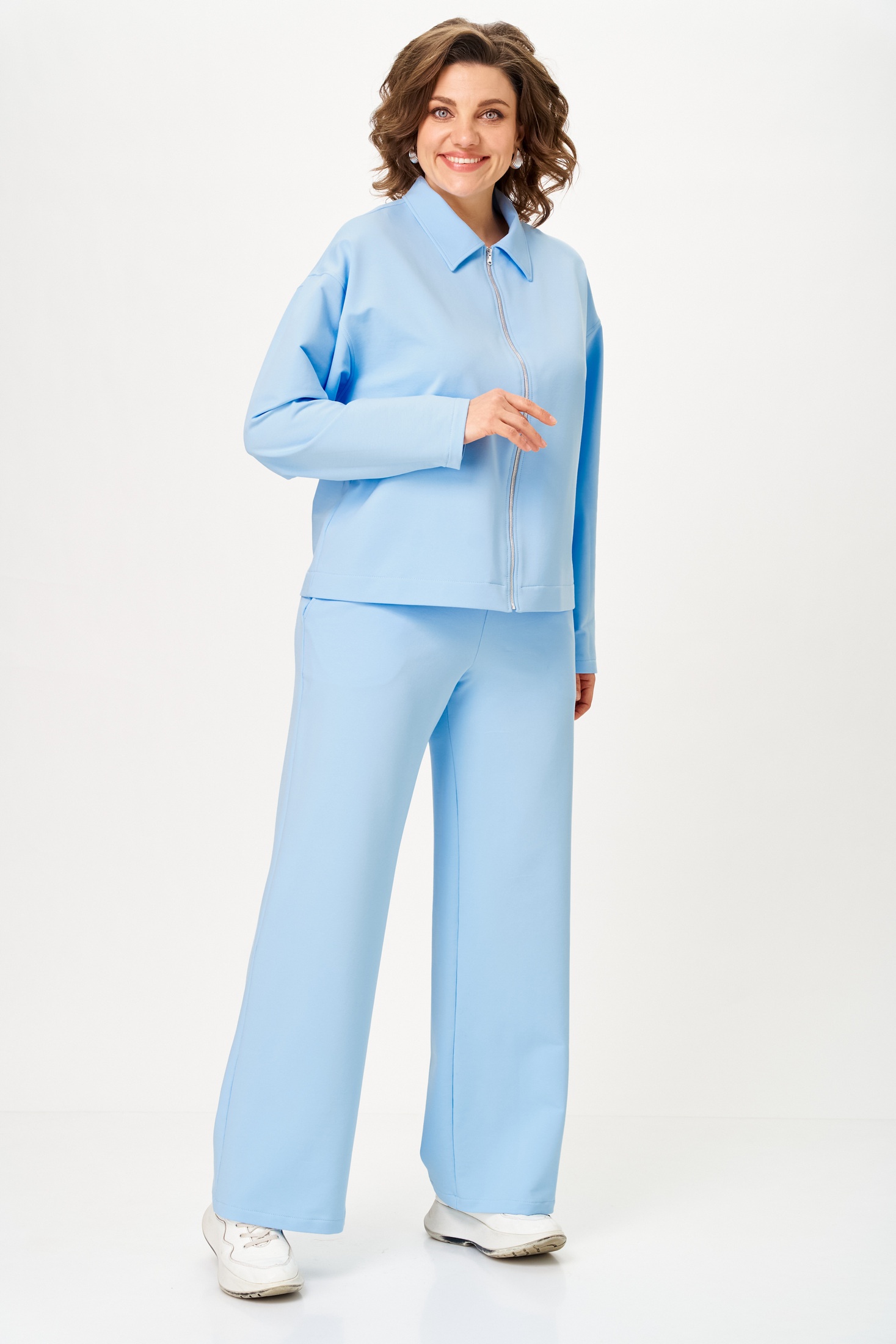 Костюм брючный 2099 STEFANY предлагает стильное сочетание джемпера и брюк, создавая идеальный двухпредметный комплект. Коллекция бренда STEFANY отличается качественным использованием хлопка, полиэстера и эластана, обеспечивая комфорт в течение всего дня. Джемпер свободного силуэта с воротником и молнией на передней части позволит вам чувствовать себя свободно и уютно. Контрастная длина переда и спинки, а также резинки на манжетах добавляют изюминку в фасон. Прямые свободные брюки с наклонными карманами и эластичной талией дополняют образ. Костюм выполнен в мягком голубом цвете, подходящем для любого сезона и повседневного использования. Длина джемпера — 60-63 см, длина брюк — 104 см.