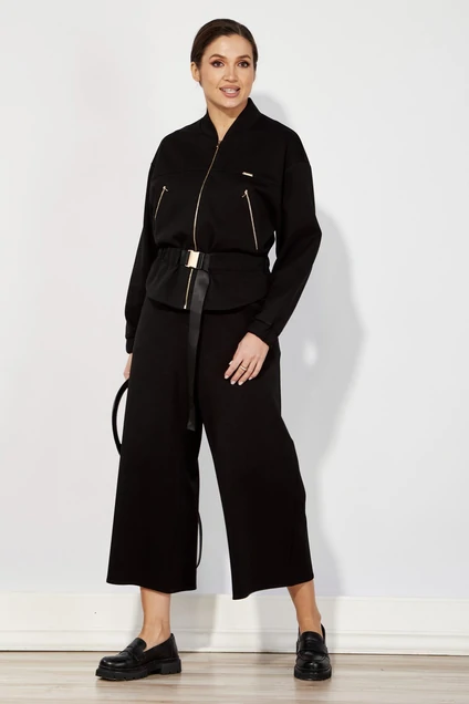 Костюм женский: жакет+ брюки. Жакет свободного объема рубашечного покроя. Застежка и вход в карманы на "тесьму-молния". Горловина обработана бейкой, по низу рукава манжеты Низ изделия имеет фигурную форму. Прилегание по линии талии достигается за счет использования пояса, затянутого в кулису. Брюки - кюлоты укороченной длины расширены к низу. Пояс притачной, сзади на резинке. Застежка на "молнию" и петлю-пуговицу. Карманы - хулиганы.