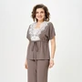Туника свободного силуэта с втачным рукавом. По горловине воротник-хомут. Перед декорирован пришивной аппликацией и стразами, по линии груди вытачки. Изюминка туники – объемные волнообразные рукава со сборками. Низ туники фигурной формы.