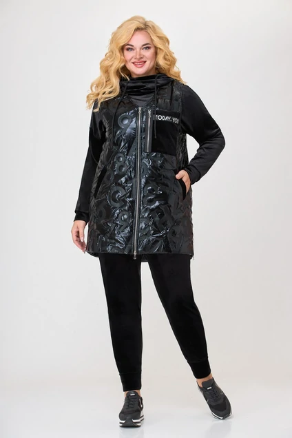 Жилет прямого силуэта из стеганой ткани. По переду большой накладной карман на молнии и два прорезных кармана с листочкой. Застежка на молнию. В боковых швах разрезы на молнии. Жилет на подкладке. Утеплитель синтепон. Накладной карман декорирован тесьмой.