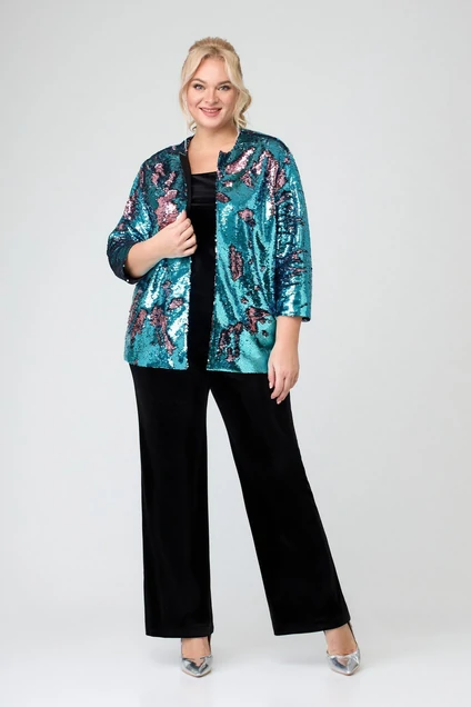 Жакет из ткани с пайетками, прямого силуэта. Линия плеча слегка спущенная. Рукав втачной длинной ¾. Жакет на подкладке.