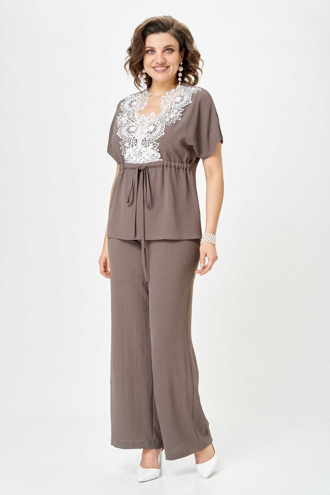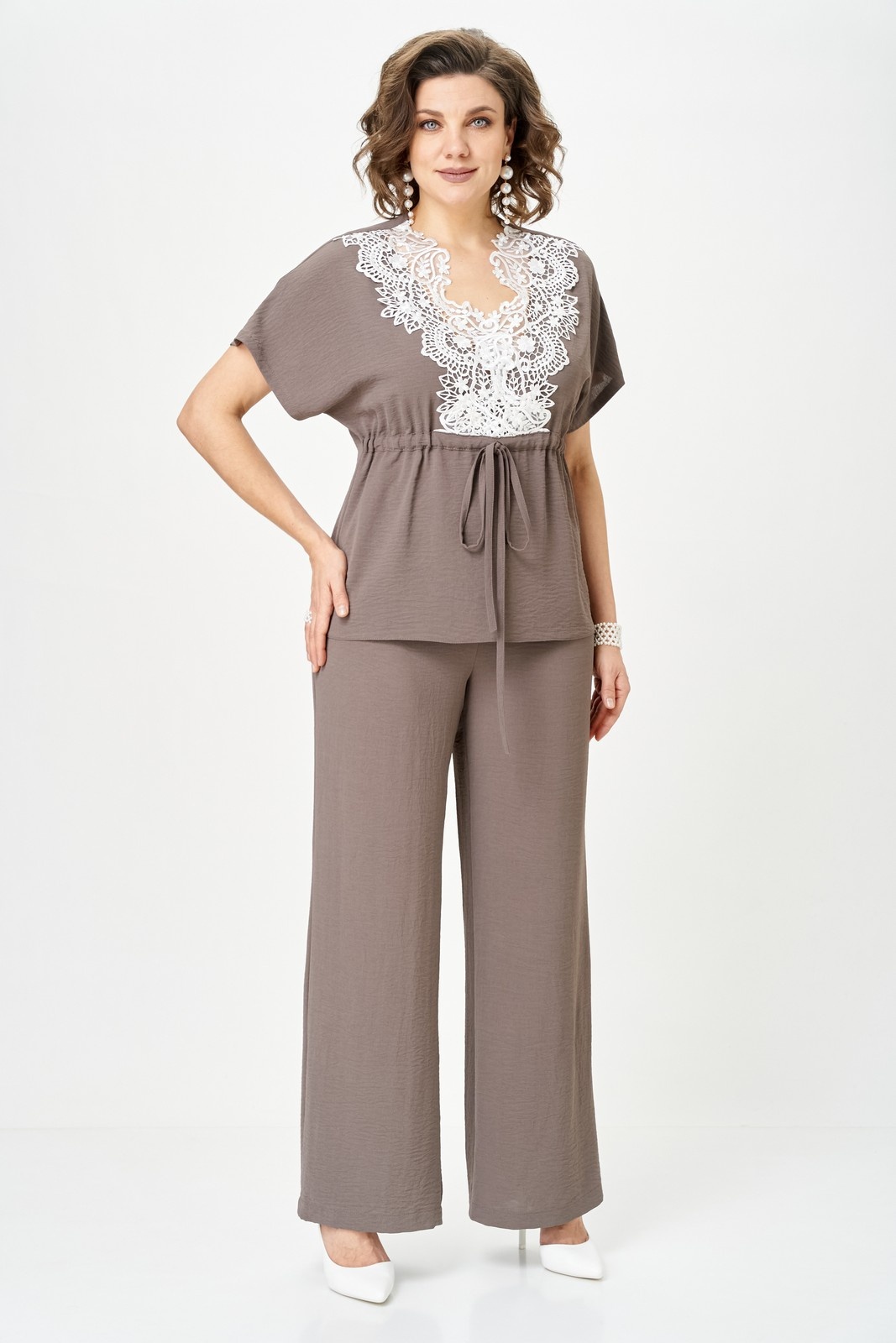 Костюм брючный 2329 мокко Svetlana Style – стильный выбор для современных женщин. Коллекция бренда Svetlana Style предлагает двухпредметный костюм, состоящий из блузки и брюк. Блузка прямого силуэта с цельнокроеным рукавом, украшенная кружевным декором и регулируемой кулисой, добавляет изюминку в классический образ. Брюки прямого кроя, оснащенные резинкой по бокам, обеспечивают комфортную посадку. Изготовленные из комбинации полиэстера, вискозы и спандекса, они подходят для офиса и повседневной носки в теплое время года. Чистый мокко цвет и практичные детали, такие как средний шов и петля с пуговицей на брюках, завершают образ. Длина спинки блузки: 61 см, длина рукава: 34 см, длина брюк: 104 см.