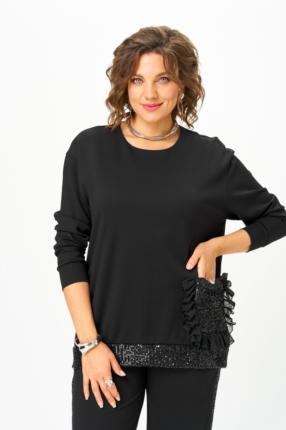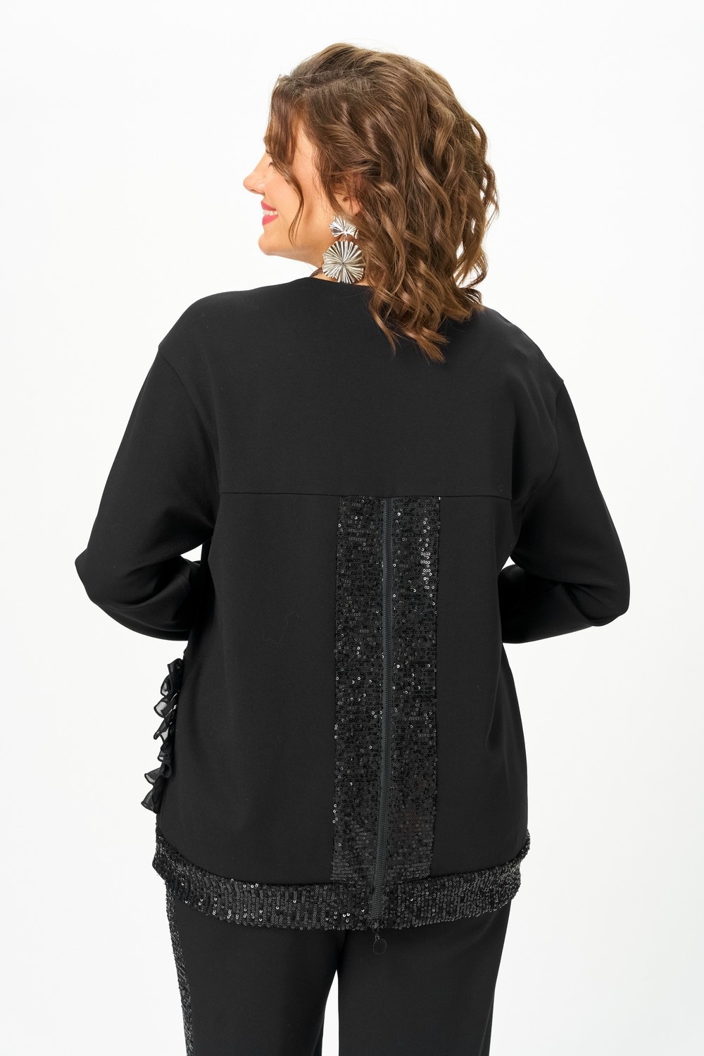 Джемпер прямого силуэта, длиной ниже линии бедер, с втачным рукавом. Линия плеча слегка спущена. Накладной карман с оборкой в нижней части переда. Спинка с кокеткой и застежкой молнией с планкой из пайетки в нижней части добавляет нотку роскоши и индивидуальности. Горловина округлой формы. Рукава длинные на притачной манжете. Пояс из пайетки по низу джемпера создает интересный силуэт и становится ярким акцентом.