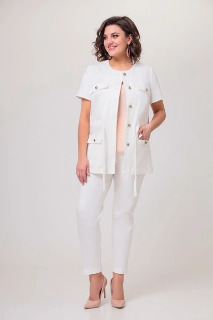 Жилет прямого силуэта без подкладки, с центральной застёжкой на петли и пробивные пуговицы. Рукав втачной, короткий. Перед с нагрудными вытачками и настрачными клапанами в области груди. В области бёдер расположены накладные карманы с клапанами, застёгивающиеся на петли и пробивные пуговицы. По линии талии предусмотрена кулиса с завязывающимся поясом. Спинка со средним швом.