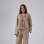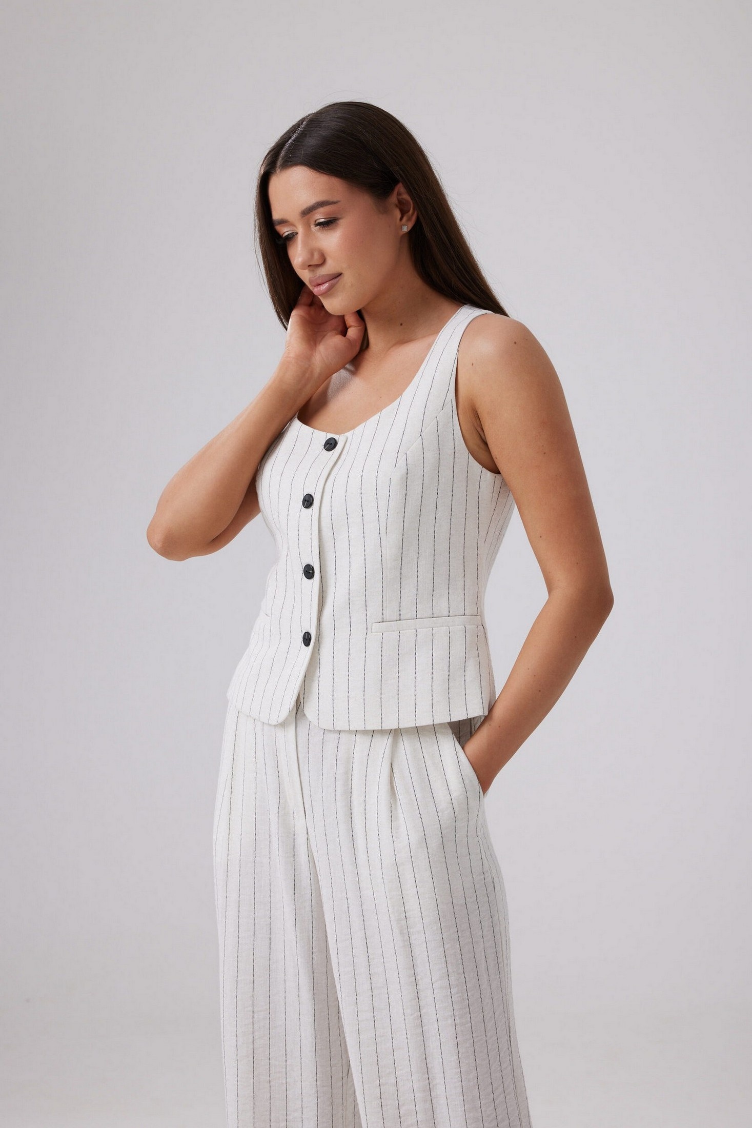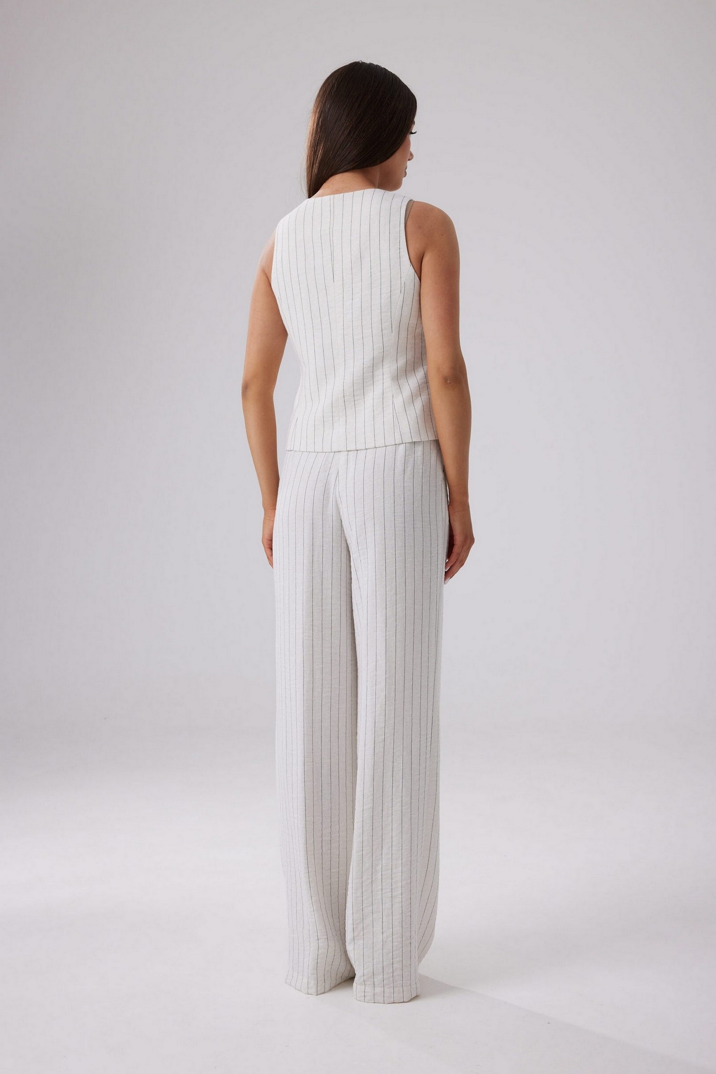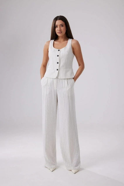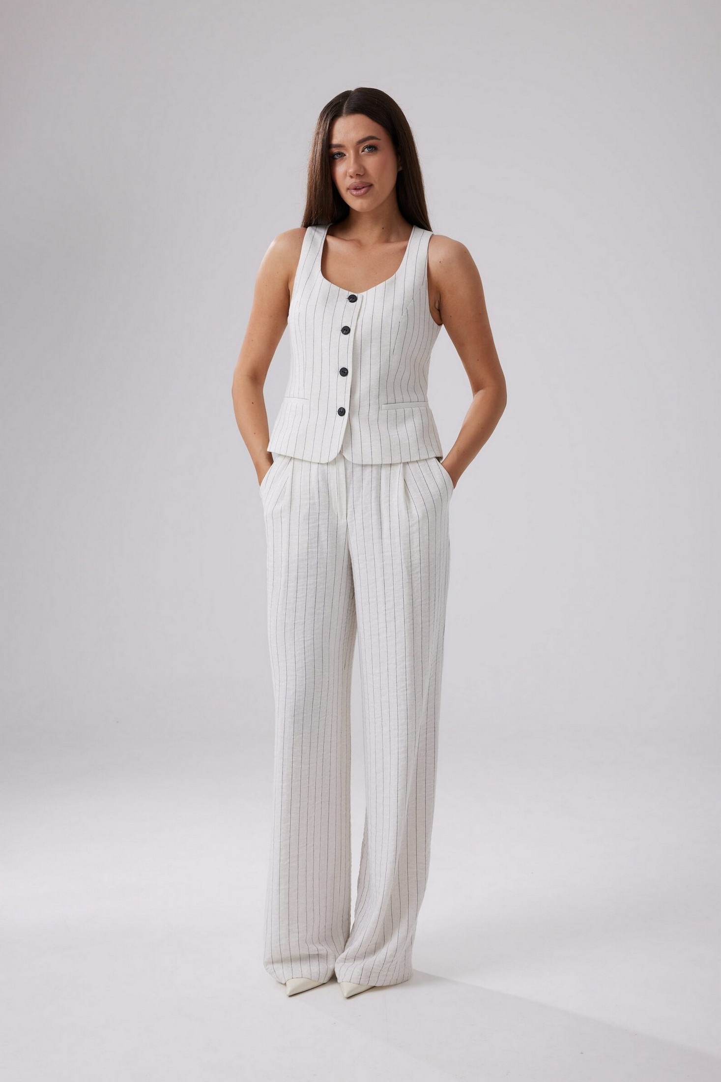 Костюм брючный 441 T.N.D. Коллекция бренда T.N.D предлагает стильный брючный костюм из двух предметов, идеально подходящий для делового гардероба. Жилет полуприлегающего силуэта из молочной полосатой ткани на хлопковой подкладке, с центральной застежкой на петли-пуговицы и округлой углубленной горловиной. За счёт структурированного кроя, спинка с центральным швом обеспечивает идеальную посадку. Широкие прямые брюки с высокой посадкой и функциональными боковыми карманами вносят элемент удобства. Они выполнены из аналогичной молочной ткани в полоску, что добавляет стилю современную элегантность. Пояс с шлевками, застёгивается на молнию и пуговицу. Длина жилета по спинке 50 см, а по боковому шву брюк с поясом 117 см. Комплект выполнен из полиэстера, вискозы, хлопка и льна, что делает костюм подходящим для осеннего и весеннего сезонов.