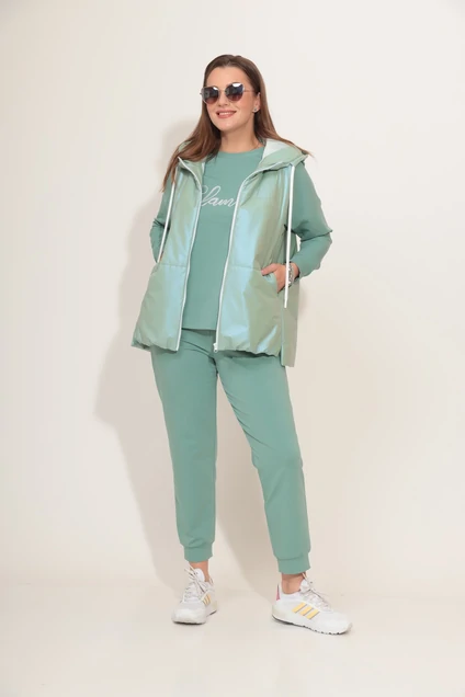 Комплект женский, 3-предметный, состоящий из жилета, свитшота и брюк. Жилет из плащевой ткани на синтепоне. По переду рельефы. В рельефах карманы. Вход а карман оформлен потайной молнией. Застежка спереди, центральная, на молнию. Горловина оформлена капюшоном с кулисой. Низ жилета разноуровневый (по спинке длиннее), чуть присборен. Снизу по рельефам небольшие разрезы!. Спинка задекорирована дизайнерской вышивкой — птица «колибри». Жилет на подкладке. Свитшот прямого силуэта. По переду и спинке рельефы. Низ разного уровня, с притачными планками по бокам. Перед задекорирован вышивкой шнуром с пайетками. Рукав длинный, со спущенной линией плеча, снизу на манжете. Горловина круглой формы с притачной бейкой. Брюки прямые, снизу на манжете. По переду наклонные карманы. Пояс притачной с резинкой по кругу.