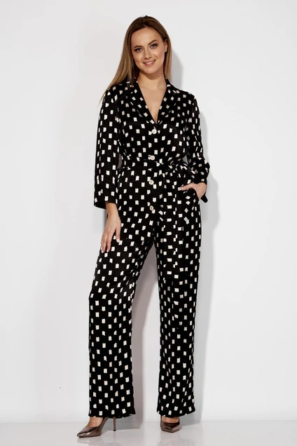 Комплект женский, 2х предметный, состоящий из облегченного жакета и брюк. Жакет прямого силуэта с рукавом длиной 3/4. Рукав втачной, по низу, с широкой притачной манжетой. По переду нагрудные вытачки. Воротник отложной с лацканами. Застежка однобортная на петли и пуговицы. По спинке талевые вытачки. Брюки прямые, широкие. По переду карманы. Пояс притачной с резинкой по кругу. Дополнением служит мягкий, съемный пояс.