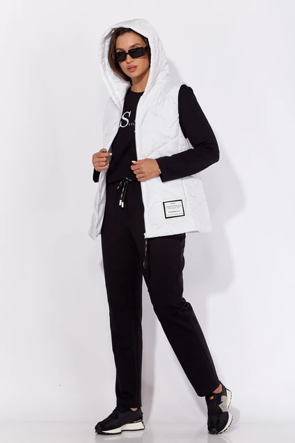 Комплект женский, 3х предметный, состоящий из жилета, свитшота и брюк. Жилет полуприлегающего силуэта, изготовлен из плащевой ткани, стеганой на синтепоне. Жилет на подкладке. По переду и спинке рельефные швы. Спереди с рельефах карманы. Вход в карман оформлен потайной"молнией" .Застежка спереди на "молнию" с декоративной тесьмой на "собачке" Проймы обработаны эластичной бейкой. Горловина оформлена капюшоном.Модным акцентом служит декоративная нашивка на полочке. Свитшот прямого силуэта с длинным втачным рукавом. Рукав задекорирован подрезами и защипами. По переду горизонтальный подрез. Верхняя часть переда акцентирована вышивкой. Горловина круглая, с подрезной бейкой. Спинка задекорирована нашивкой с отделочной тесьмой. Брюки прямые с наклонными карманами спереди. Область колена акцентирована подрезом и защипами. Пояс с резинкойпо кругу и декоративной кулисой спереди.