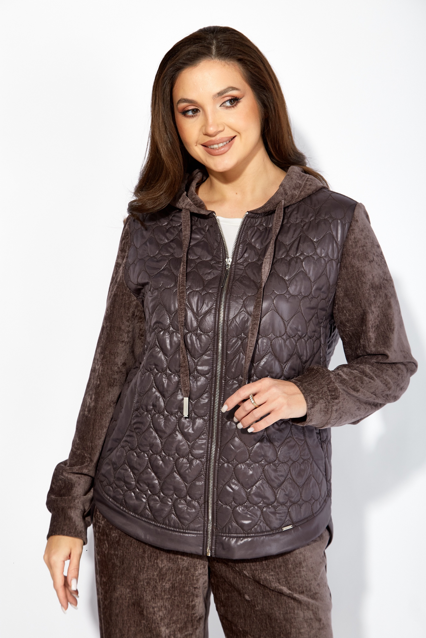 Комплект женский, 2х предметный, состоящий из куртки и брюк, выполнен из двух видов материала. Куртка с сочетании плащевки стеганой на синтепоне и Миланский вельвет со стрейчем. По переду рельефы из пройм, карманы. Вход в карман закругленной формы с отрезной планкой. Застежка центральная на тесьму "молния" Низ куртки фигурной формы, по спинке удлиннен, с отрезной планкой. Рукав длинный, втачной, по низу на манжете. Горловина оформлена капюшоном с кулисой по краю . Брюки прямые, выполнены из ткани Миланский вельвет. По переду наклонные карманы. Пояс притачной с резинкой по кругу.