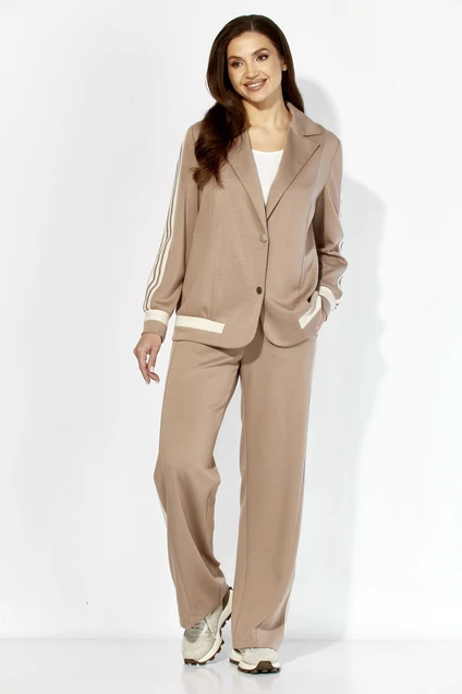 Костюм брючный 1421 бежевый ТАиЕР. Коллекция бренда ТАиЕР предлагает стильный брючный костюм, выполненный из трикотажного полотна 'TENSEL'. Жакет прямого силуэта с отложным воротником и лацканами имеет закругленный крой и застежку на кнопки. Длинные втачные рукава украшены декоративными лампасами и манжетой. Брюки прямые, с карманами и эластичным поясом, дополнены отделочным лампасом. Костюм представлен в бежевом цвете, отличаясь повседневным стилем, и подойдёт для прохладного сезона.
