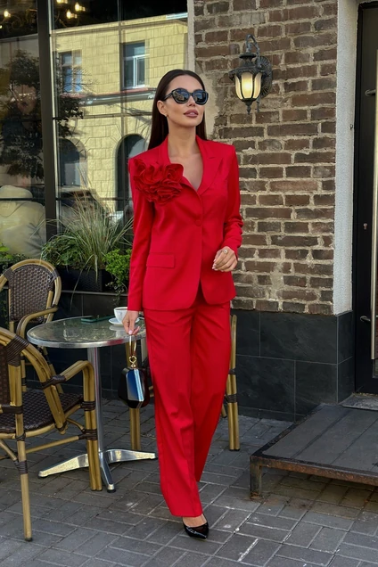Костюм двух предметный состоящий из жакета и брюк. Жакет на подкладке полуприлегающего силуэта с застежкой на петлю и пуговицу, по переду обработаны прорезные карманы с клапаном, рельефные швы, слева в верхней часли листочка и декоративный сьемный цветок. Спинка со средним швом, рельефами и шлицей. Рукав втачной, двухшовный, по локтевому швау расположены шлицы с застежкой на три пуговиц. Брюки прямые на поясе, застежка на пуговицу и тесьму молнию, с боковыми карманами. Длина жакета 66см, длина рукава 61см, длина брюк с учетом пояса 110см.