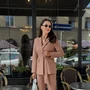 Элегантный костюм, состоит из жакета и брюк, жакет полуприлегающего силуэта, с двубортной застежкой на петли и пуговицы, рельефными швами. Воротник-шаль, рукав реглан со складками сверху. В области талии отрезная кулиска, в которую вставляется резинка. Длина ниже линии бедер, на подкладке. Брюки палаццо, на поясе на резинке без застежки, карманы в боковых швах.
