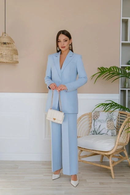 Брюки на поясе расширенные от бедра к низу с застежкой на петли и пуговицы.