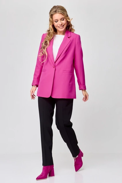 Невероятно притягивающий костюм состоит из яркого жакета, черных брюк и легкой белой блузки.